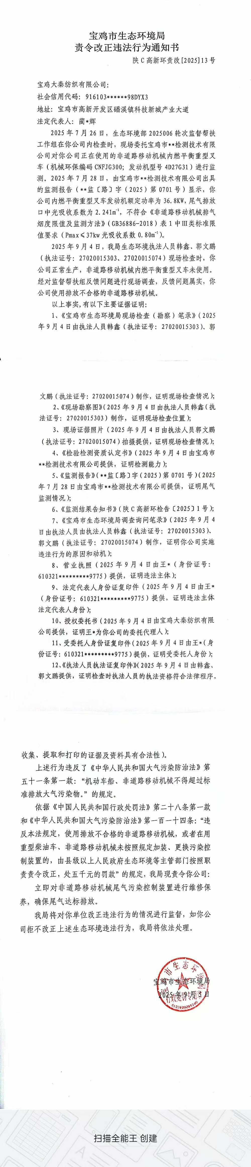 十大网赌平台排行榜责令改正违法行为决定书(陕C高新环责改〔2025〕13号)