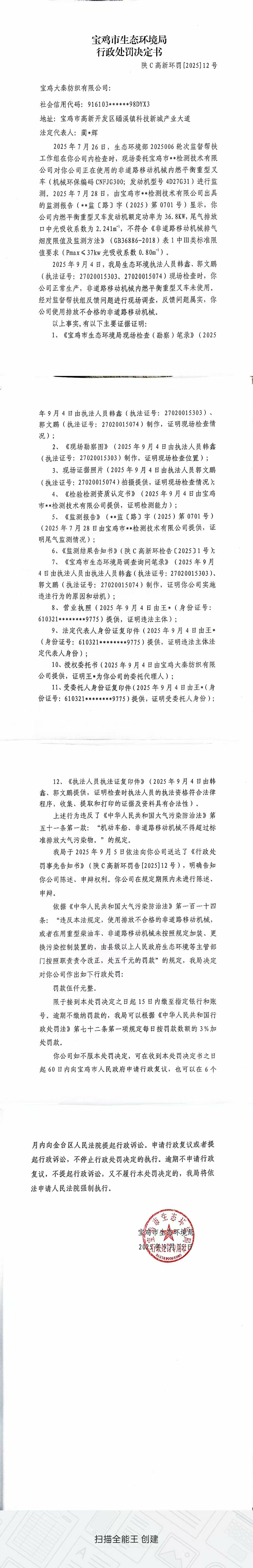 十大网赌平台排行榜行政处罚决定书(陕C高新环罚[2025]12号)