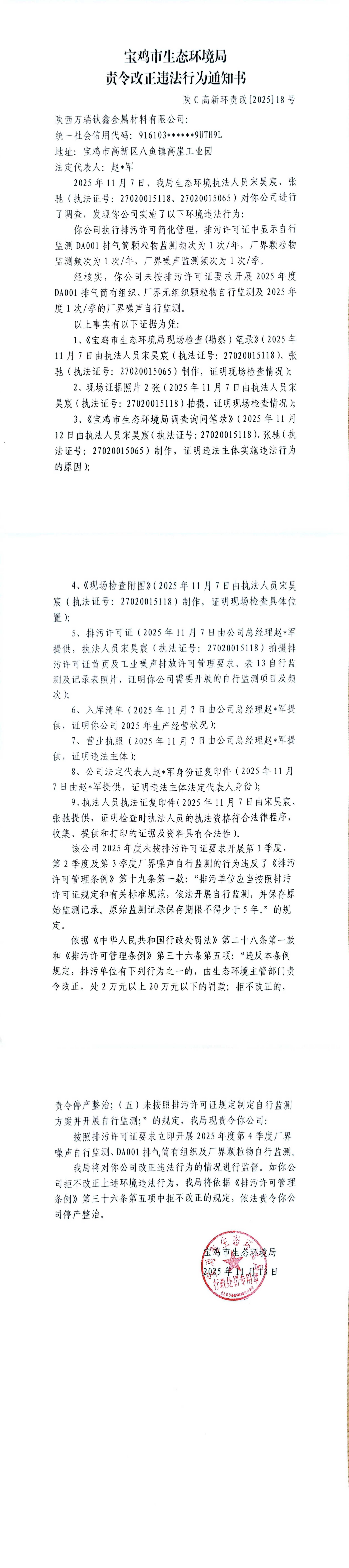 十大网赌平台排行榜责令改正违法行为决定书(陕C高新环责改〔2025〕18号)