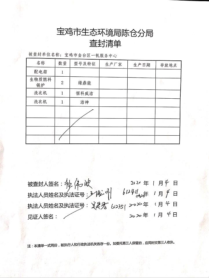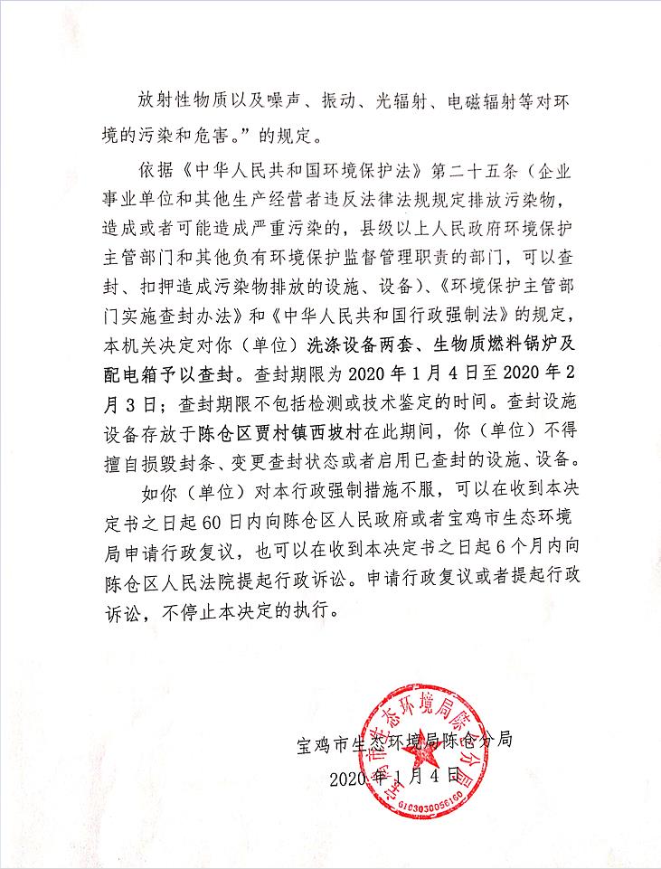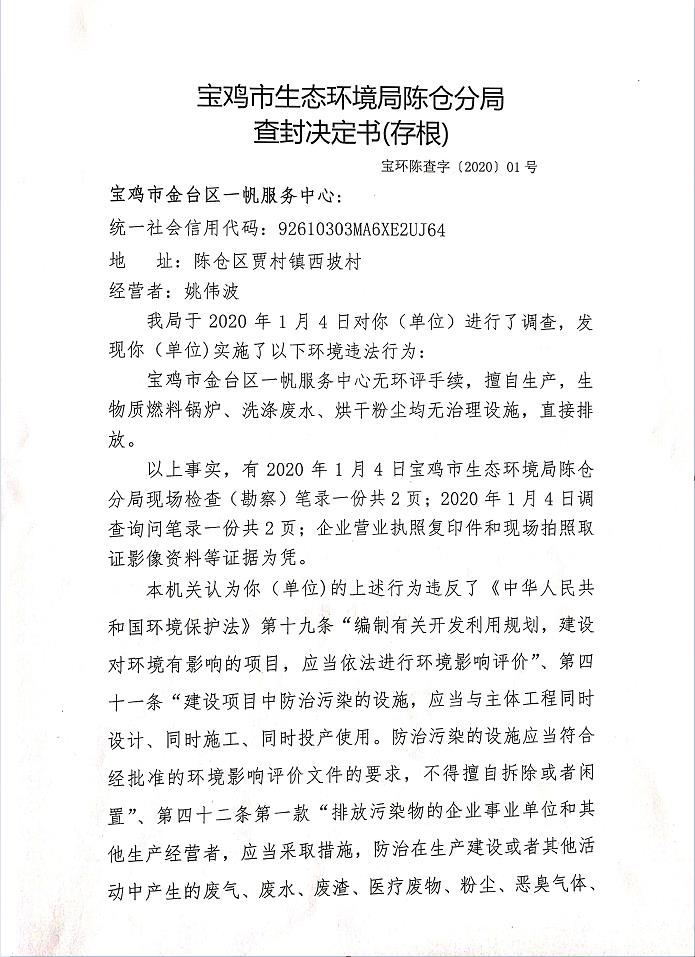 十大网赌平台排行榜陈仓分局查封决定书(存根)(宝环陈查字[2020]01号)
