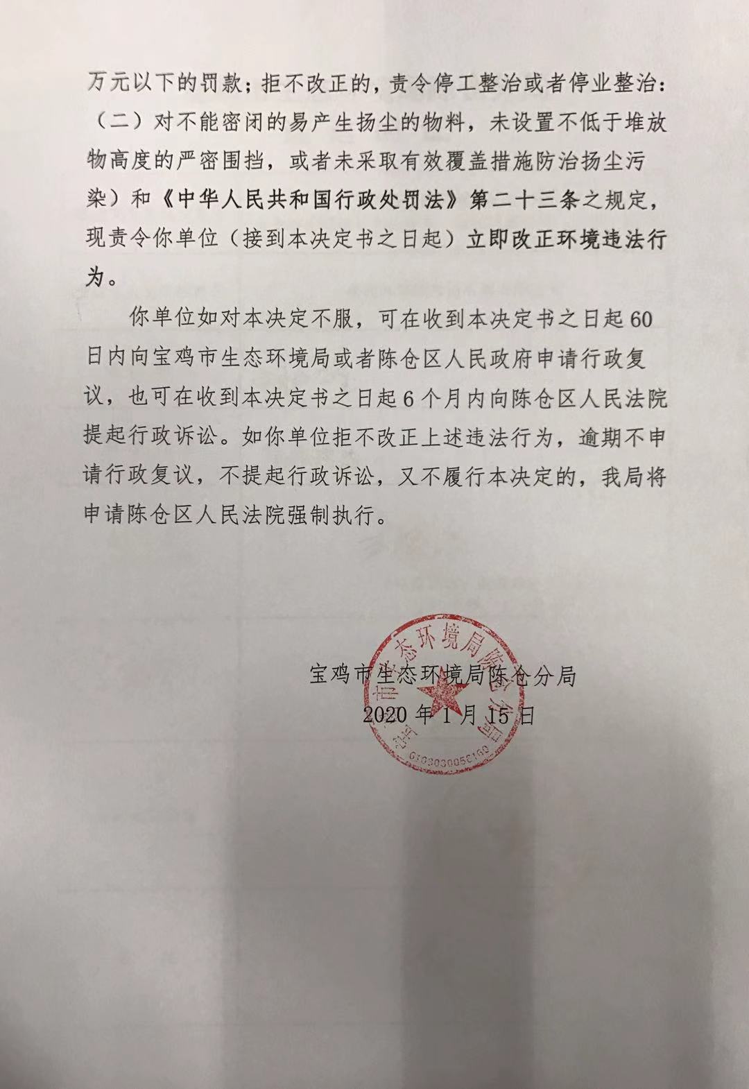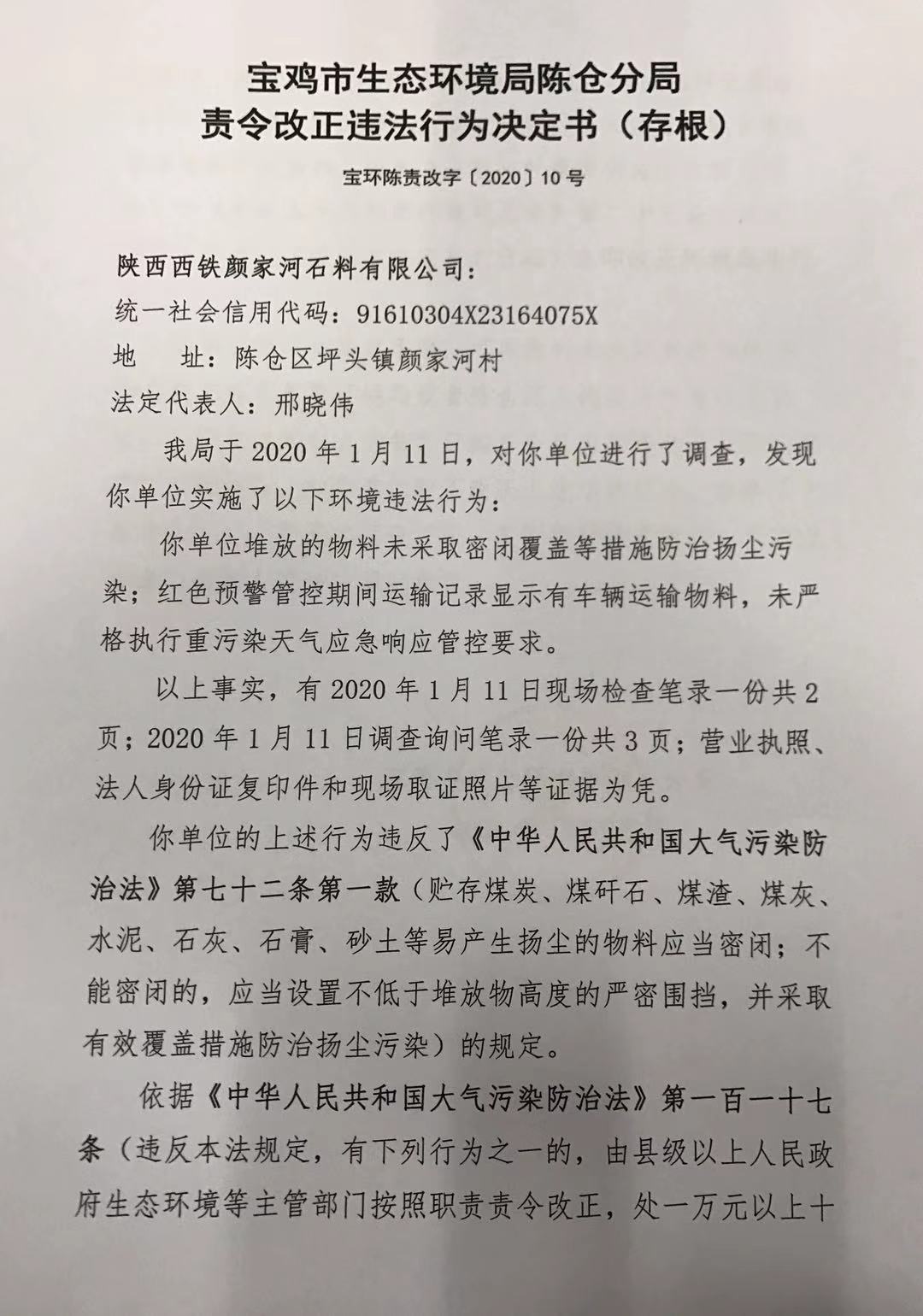 十大网赌平台排行榜陈仓分局 责令改正违法行为决定书(存根) 宝环陈责改字〔2020〕10号