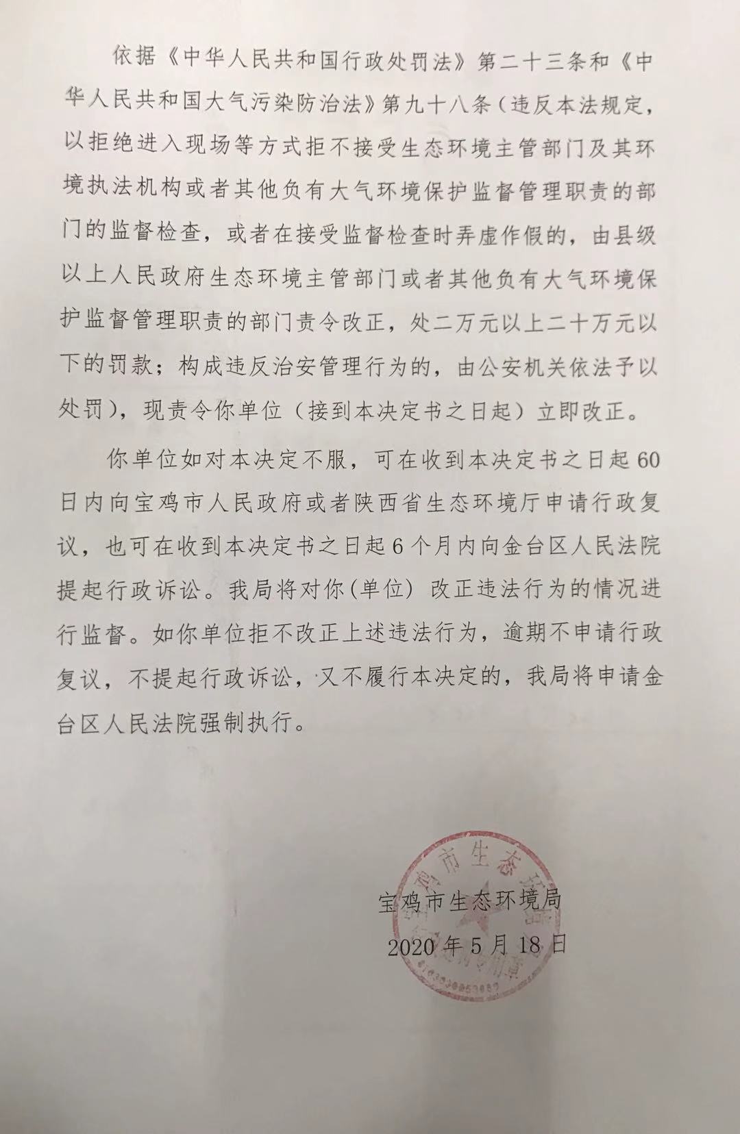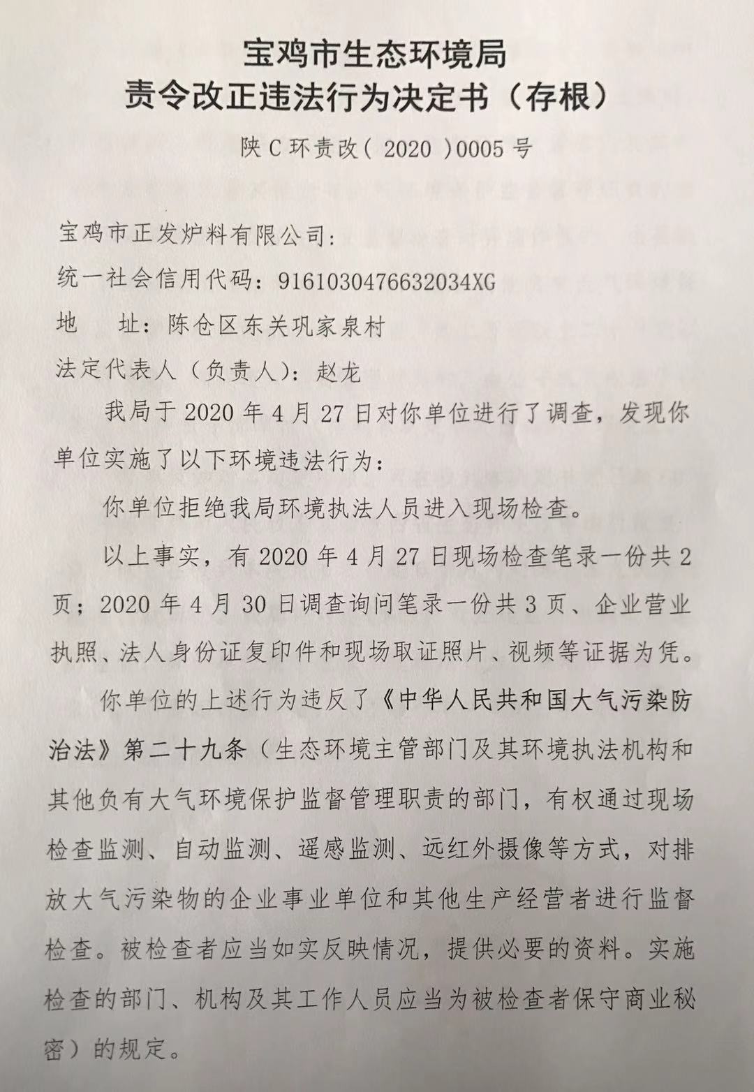 网赌平台 责令改正违法行为决定书(存根) 陕C环责改( 2020 )0005号
