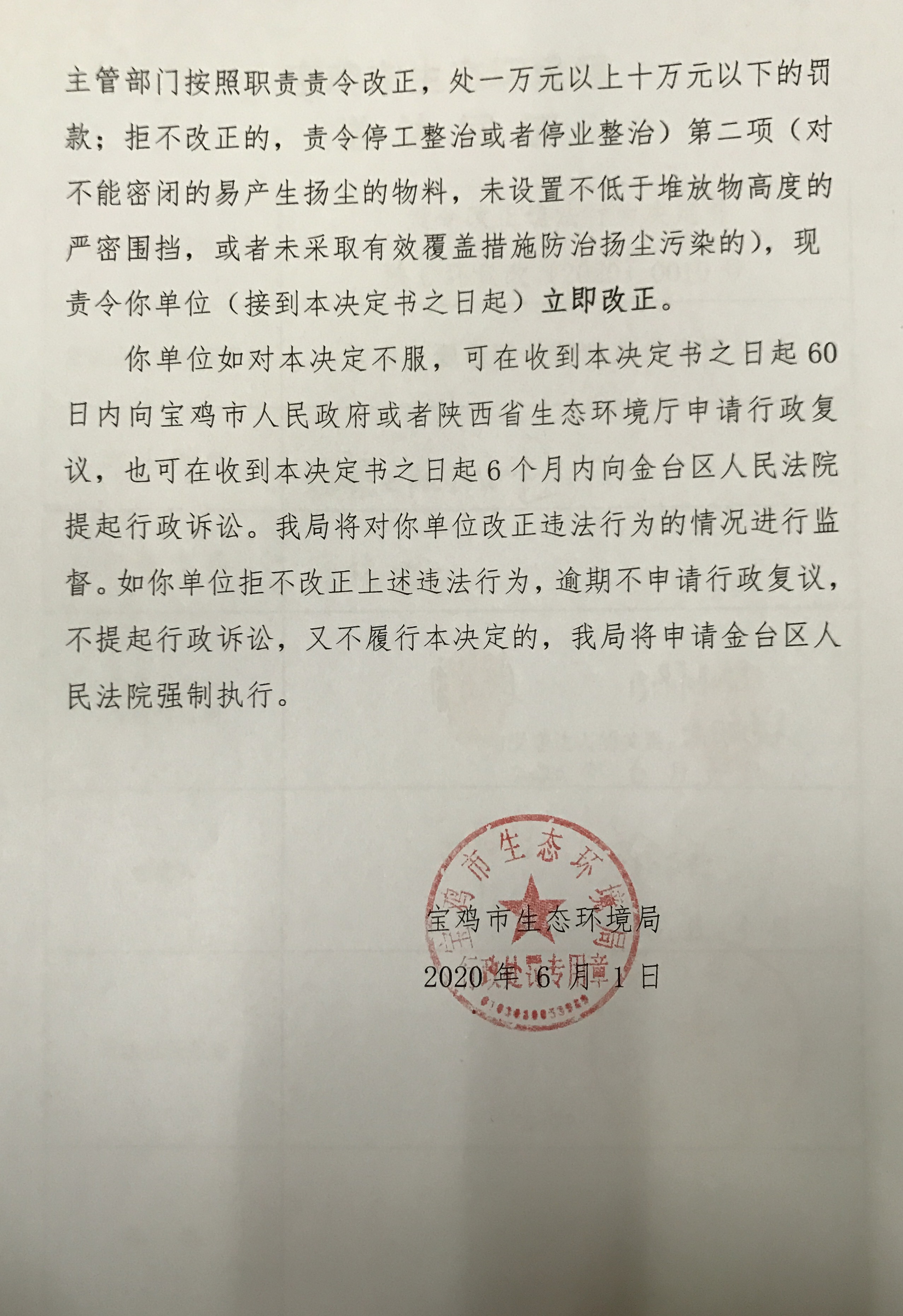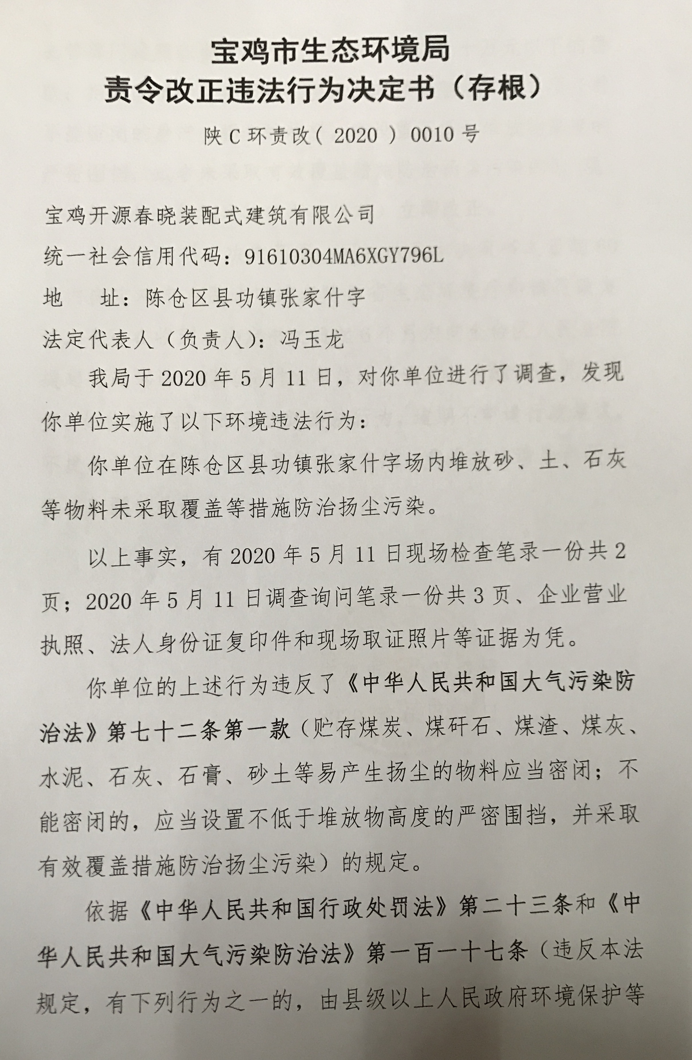 十大网赌平台排行榜 责令改正违法行为决定书(存根) 陕C环责改( 2020 ) 0010号