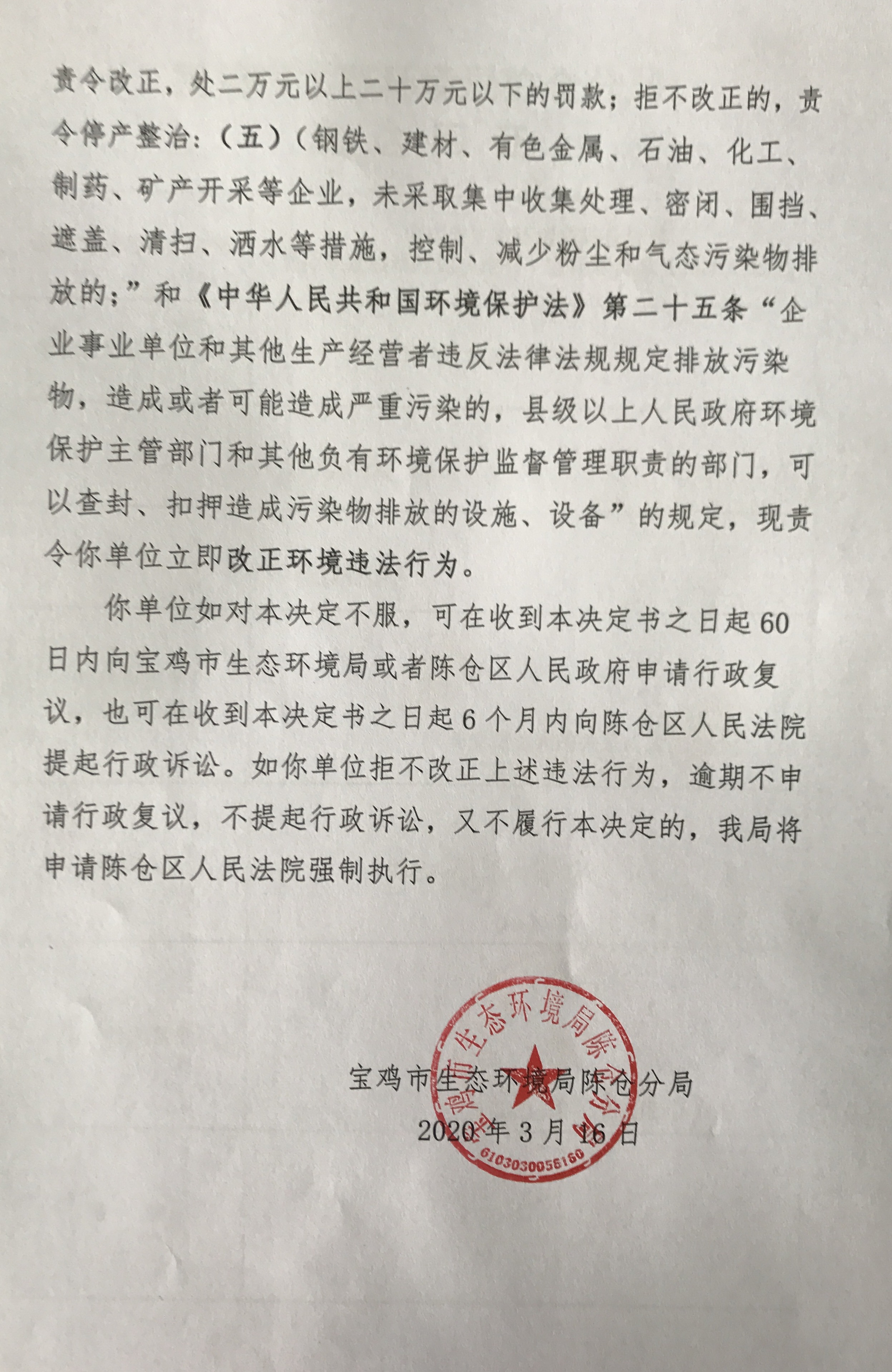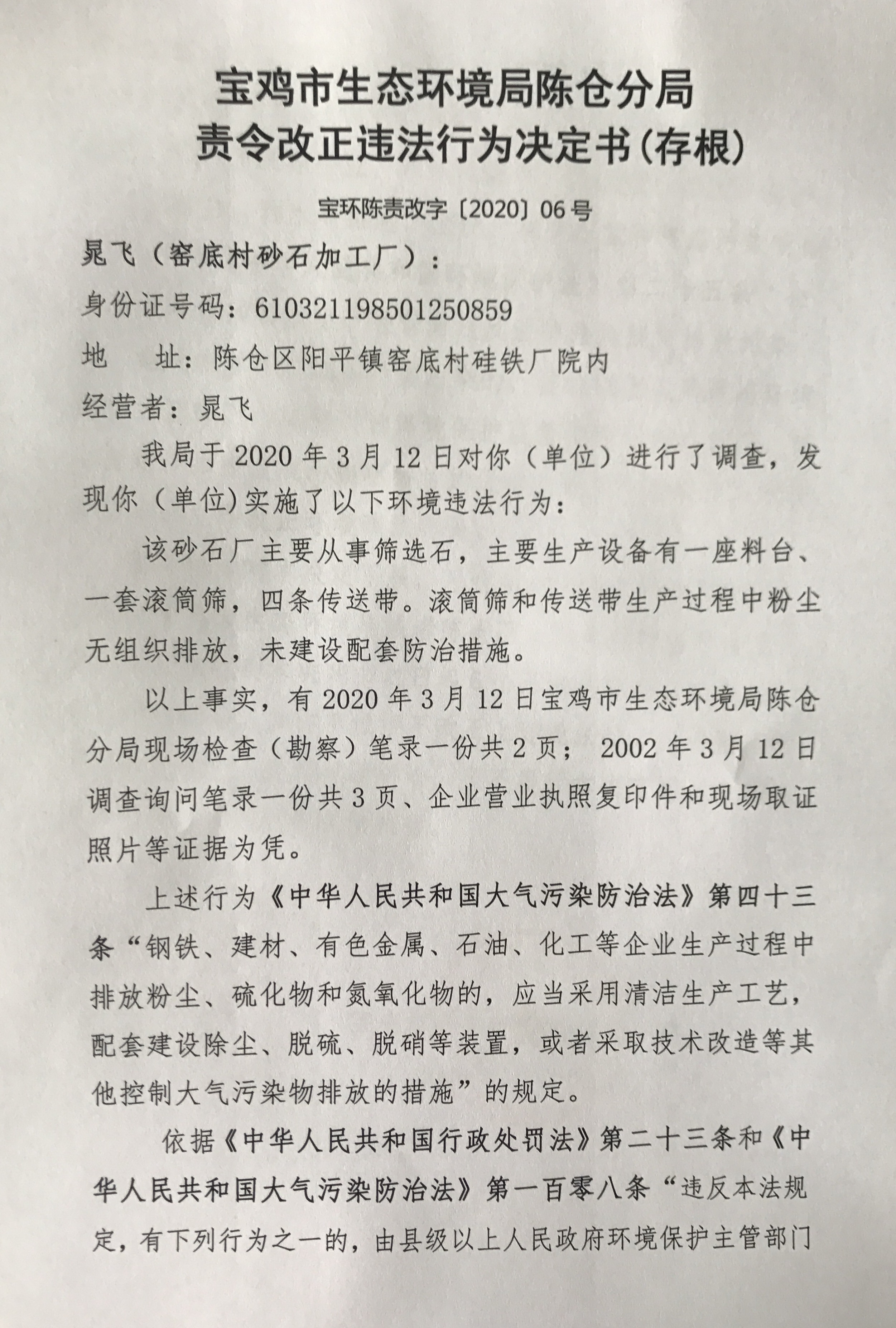 网赌平台陈仓分局责令改正违法行为决定书(存根) 宝环陈责改字〔2020〕06号