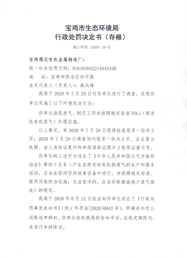 网赌平台行政处罚决定书(存根)陕C环罚(2020)39号