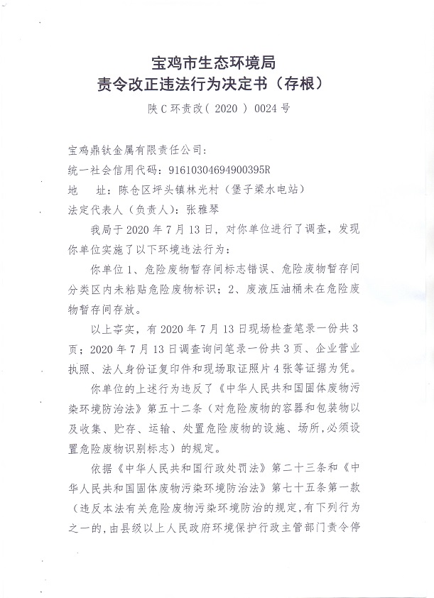 网赌平台责令改正违法行为决定书(存根)陕C环责改(2020)0024号