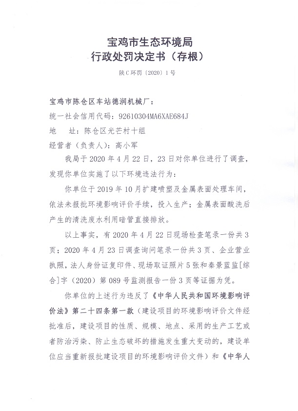 网赌平台行政处罚决定书(存根)陕C环罚(2020)1号