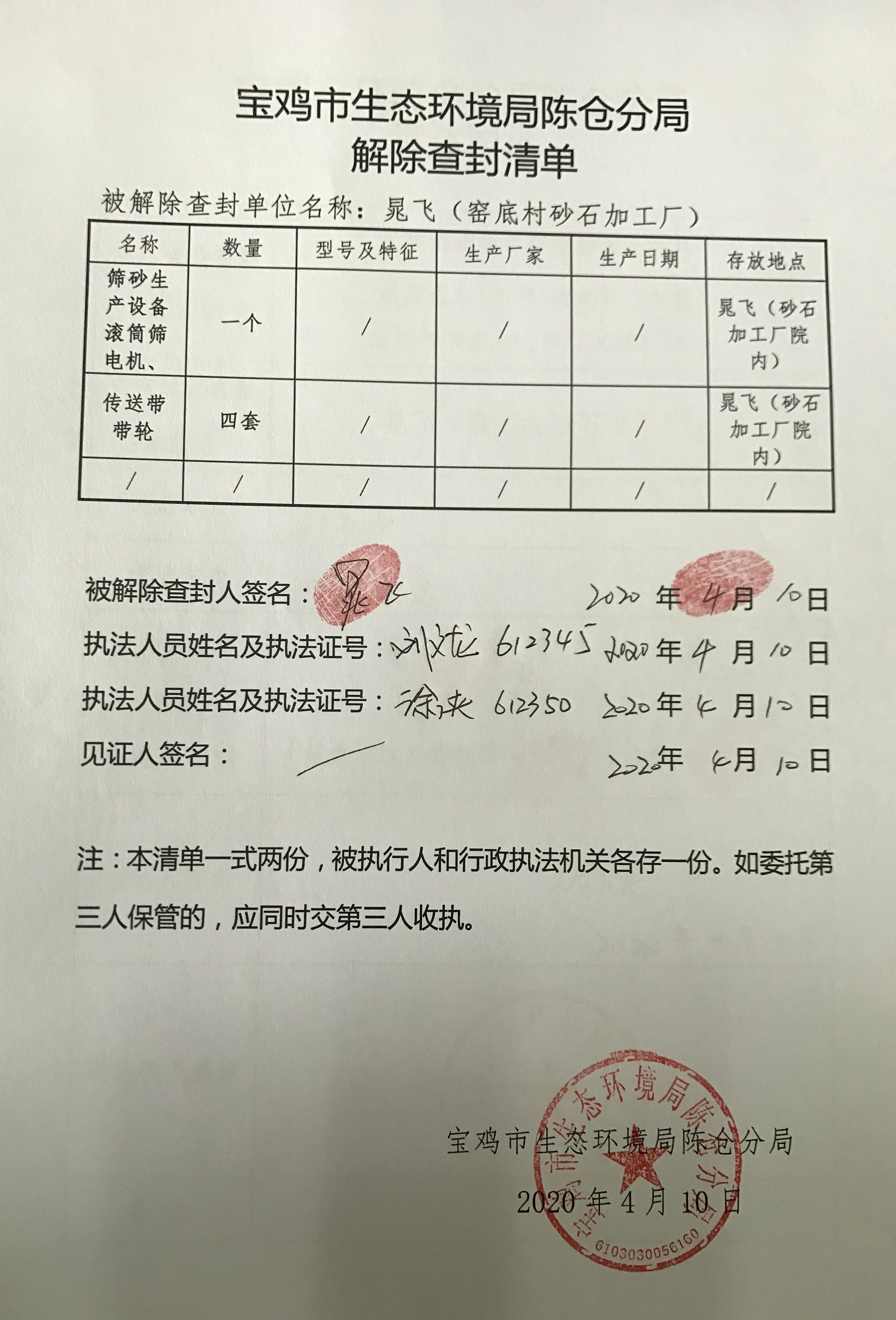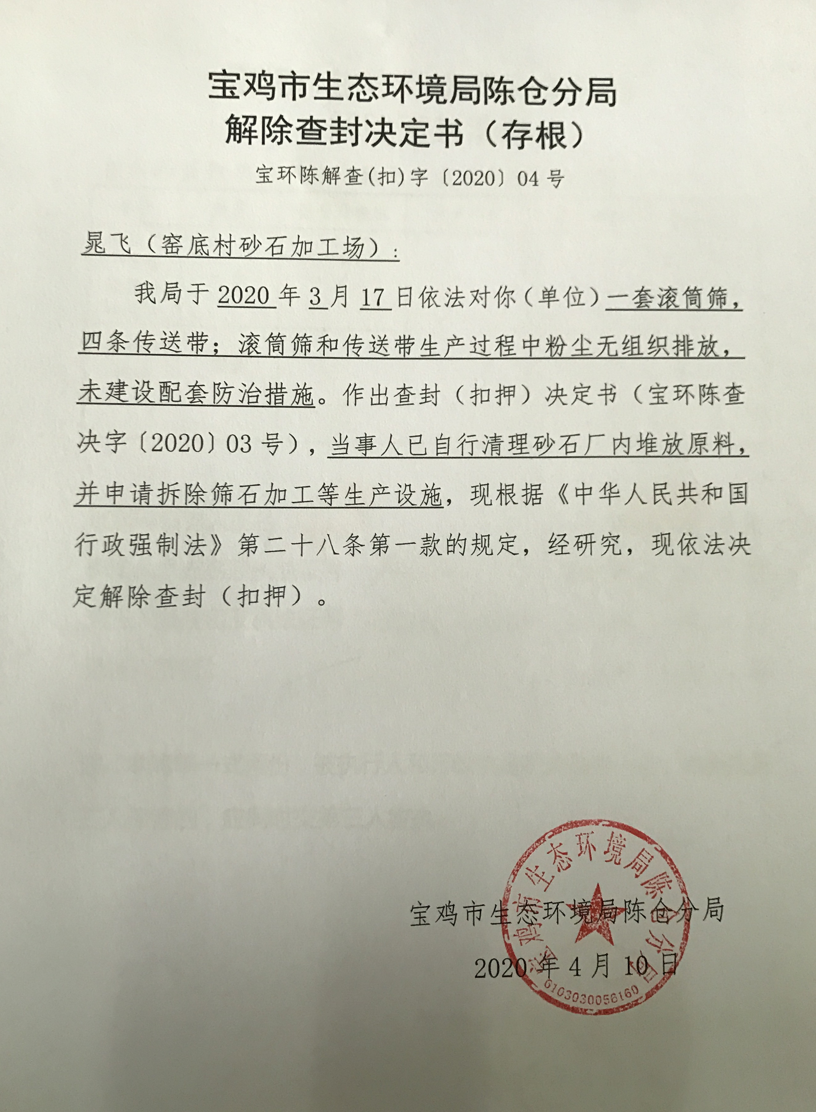 网赌平台陈仓分局 解除查封决定书(存根) 宝环陈解查(扣)字〔2020〕04号