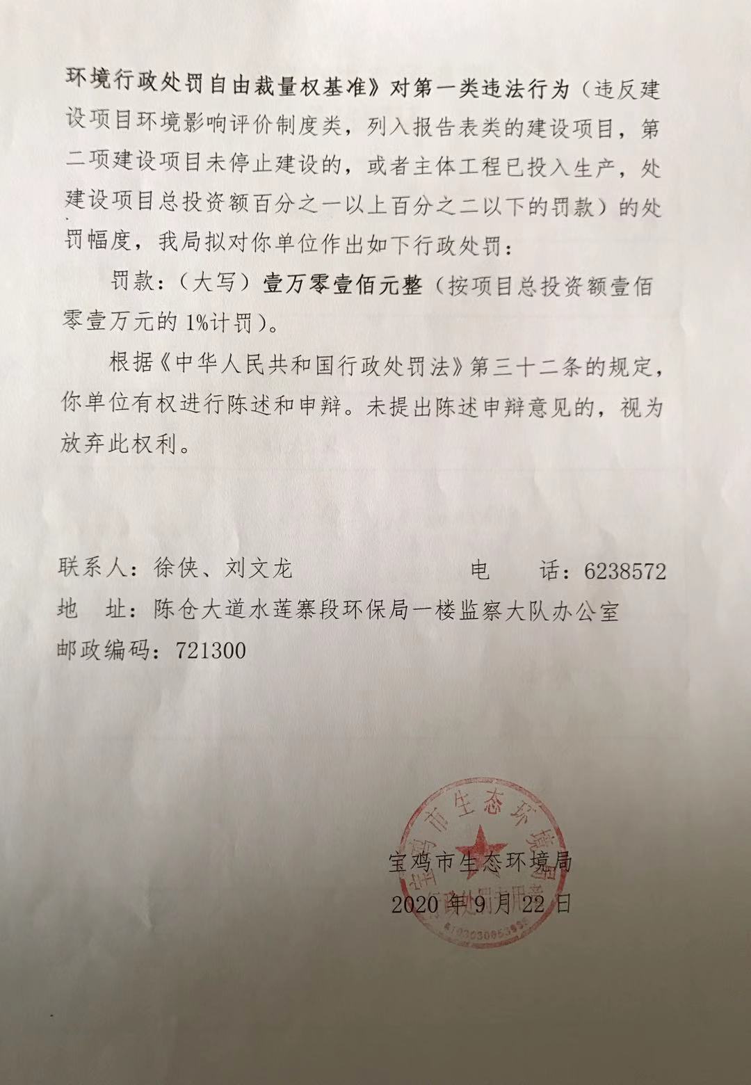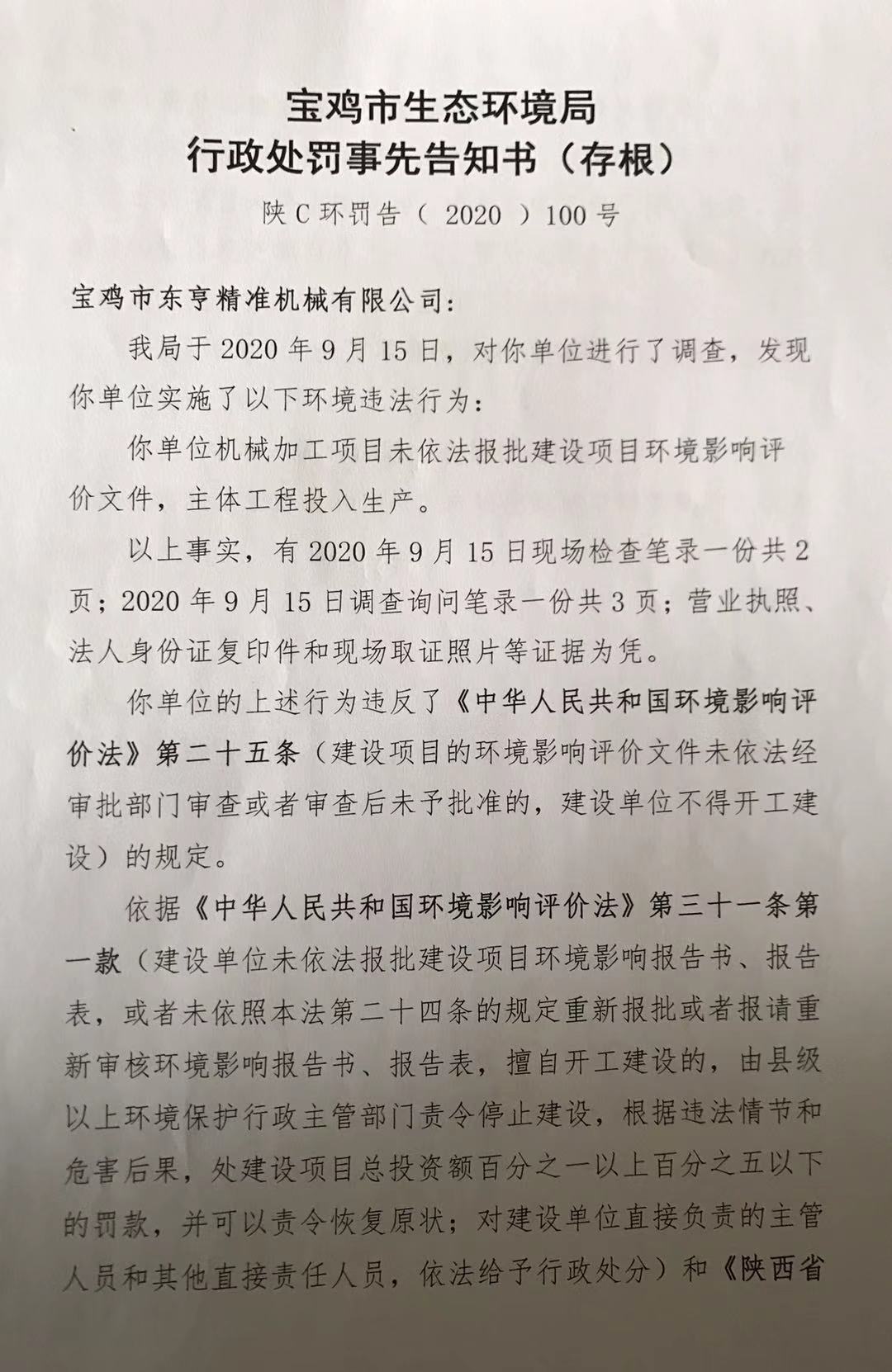 十大网赌平台排行榜 行政处罚事先告知书(存根) 陕C环罚告( 2020 )100号