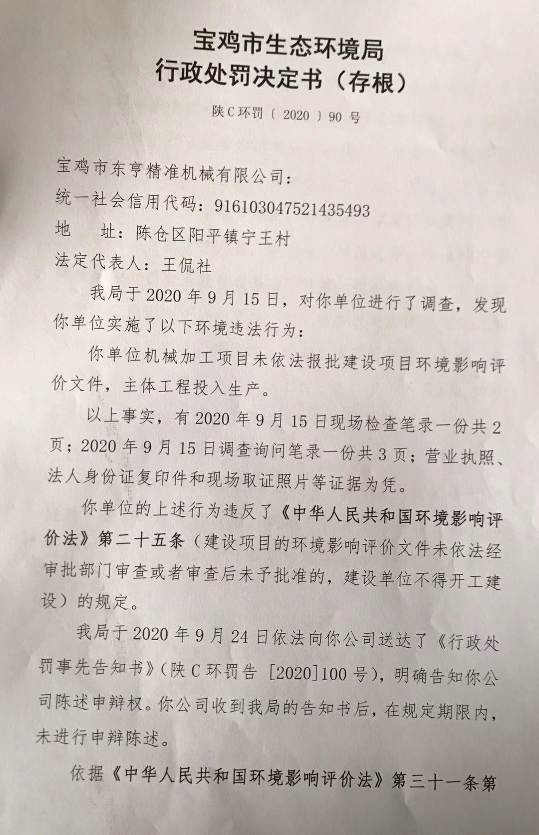 网赌平台 行政处罚决定书(存根) 陕C环罚〔 2020 〕90 号
