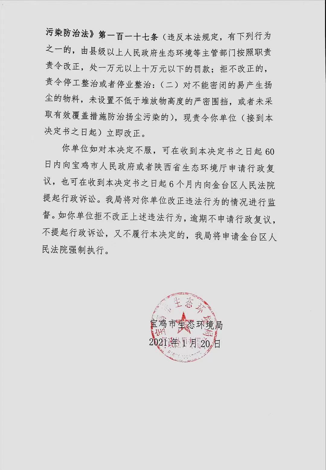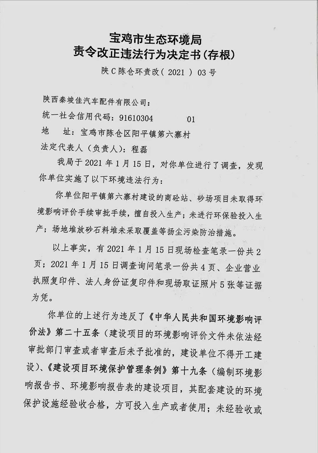网赌平台 责令改正违法行为决定书(存根) 陕C陈仓环责改( 2021 ) 03号