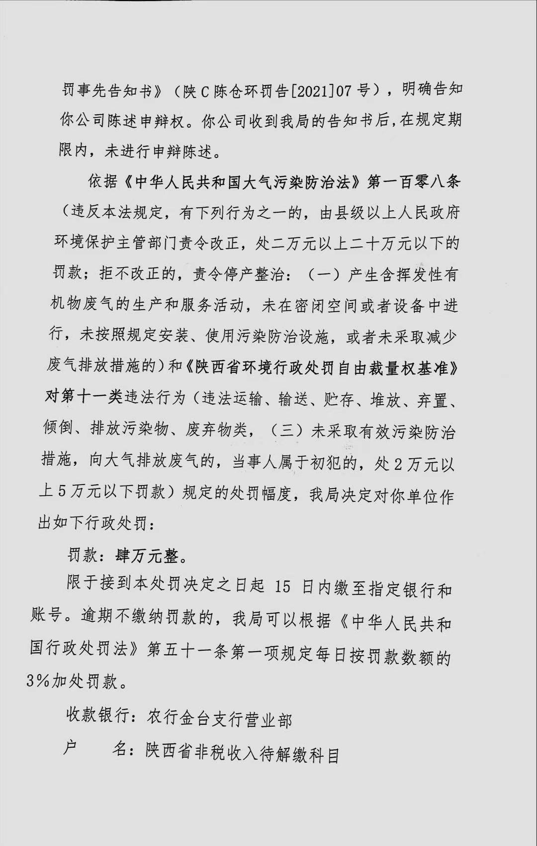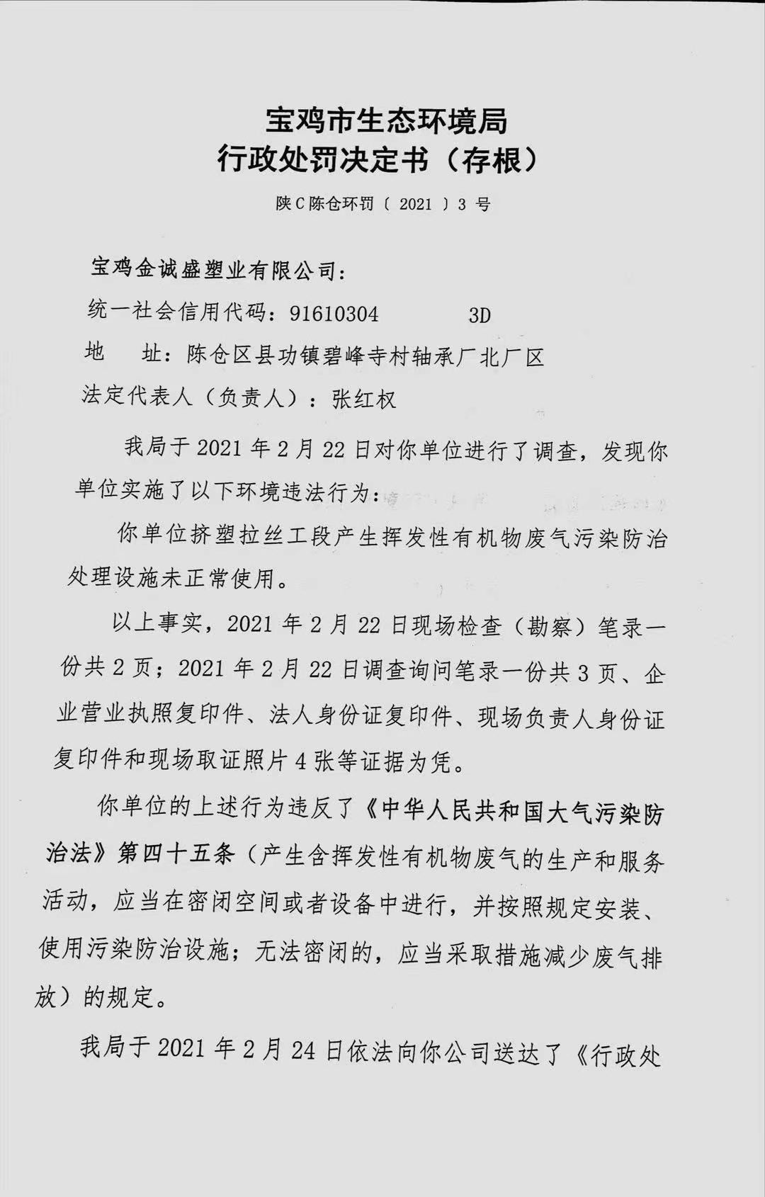 网赌平台 行政处罚决定书(存根) 陕C陈仓环罚〔 2021 〕3号