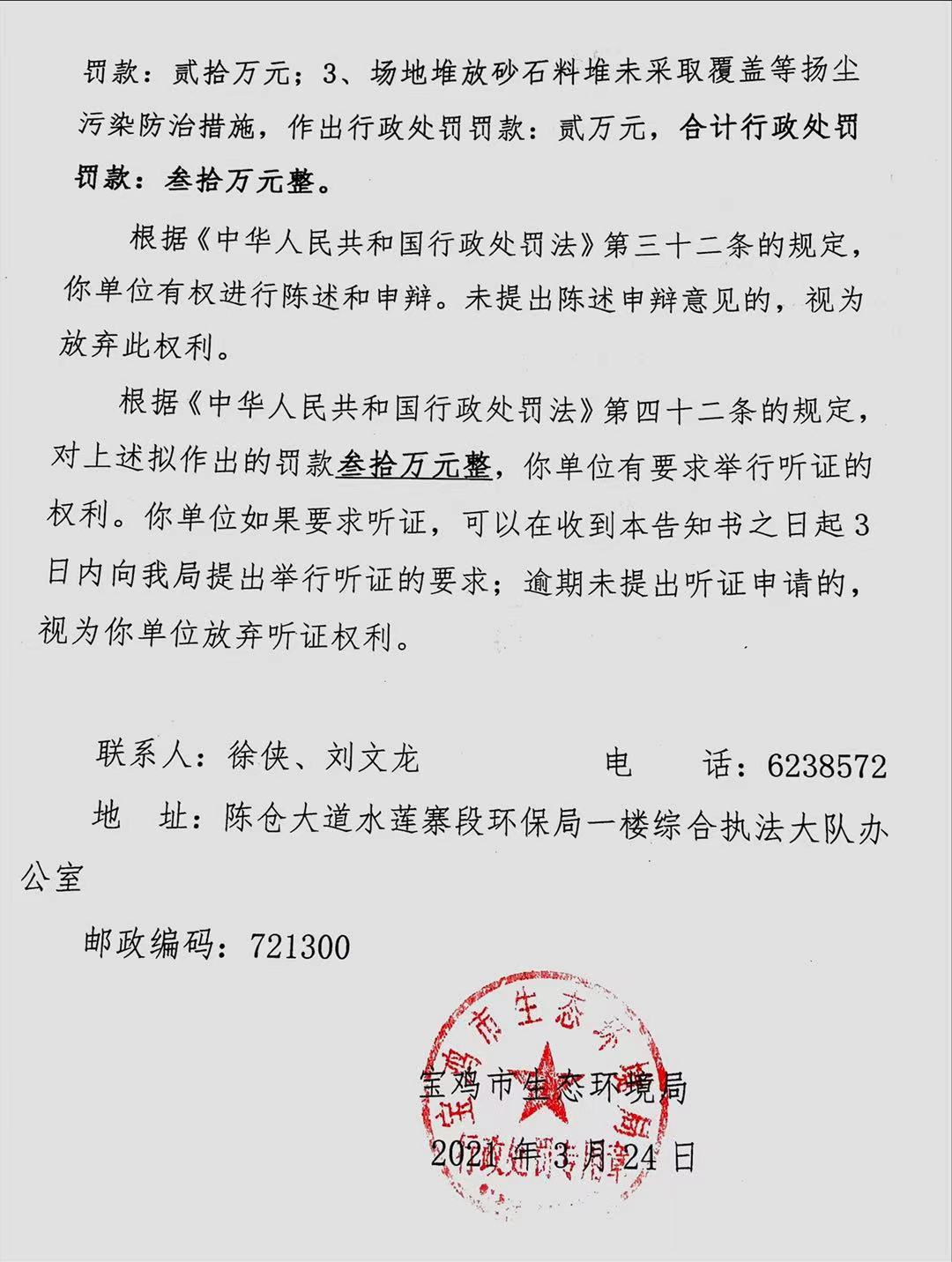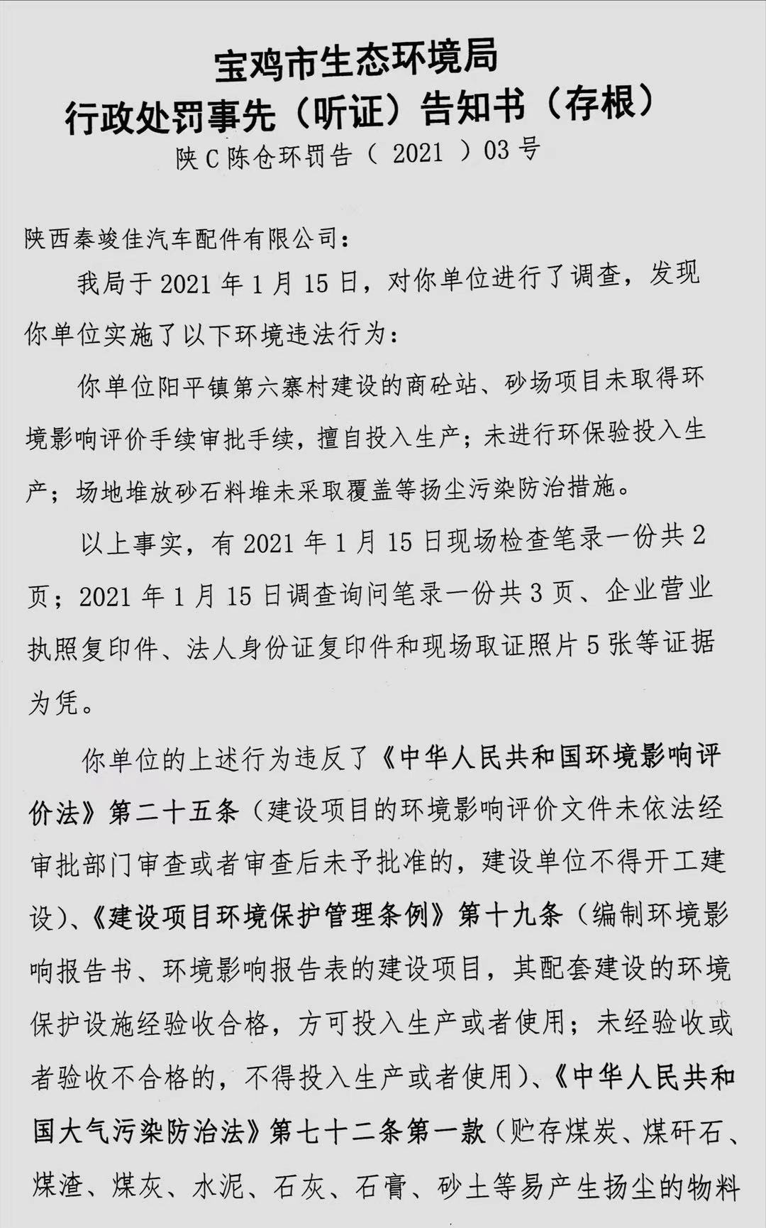 十大网赌平台排行榜 行政处罚事先(听证)告知书(存根) 陕C陈仓环罚告( 2021 )03号