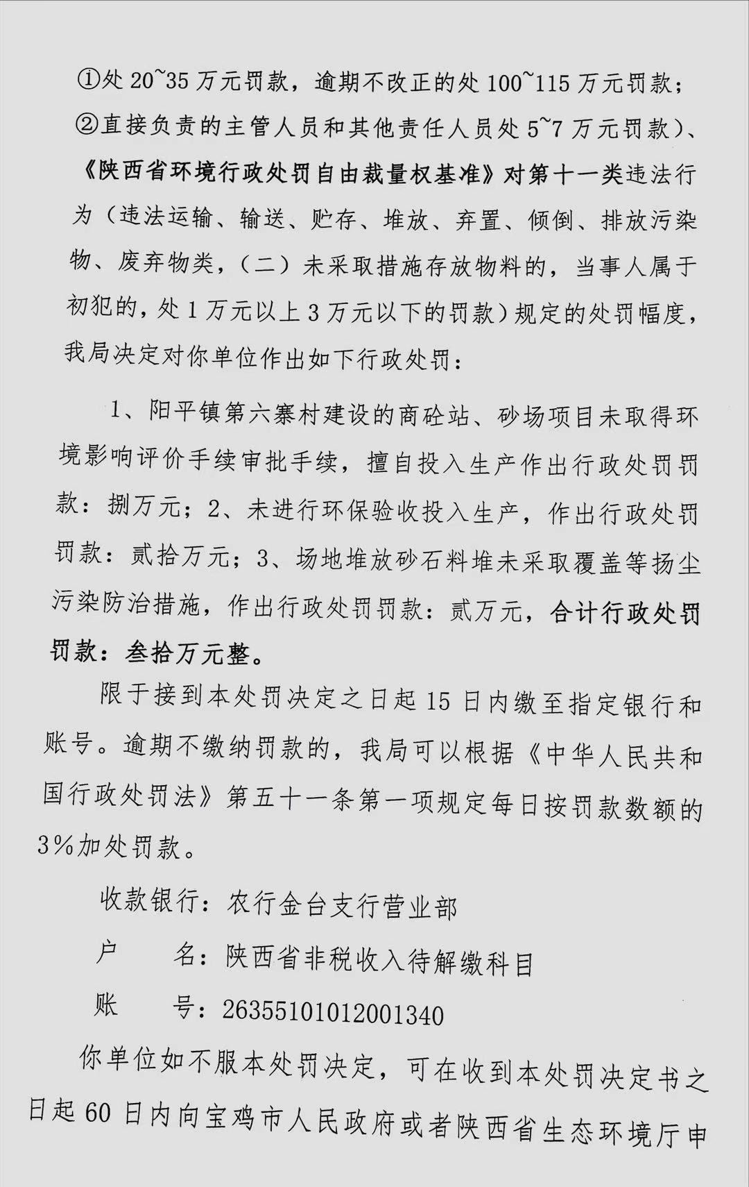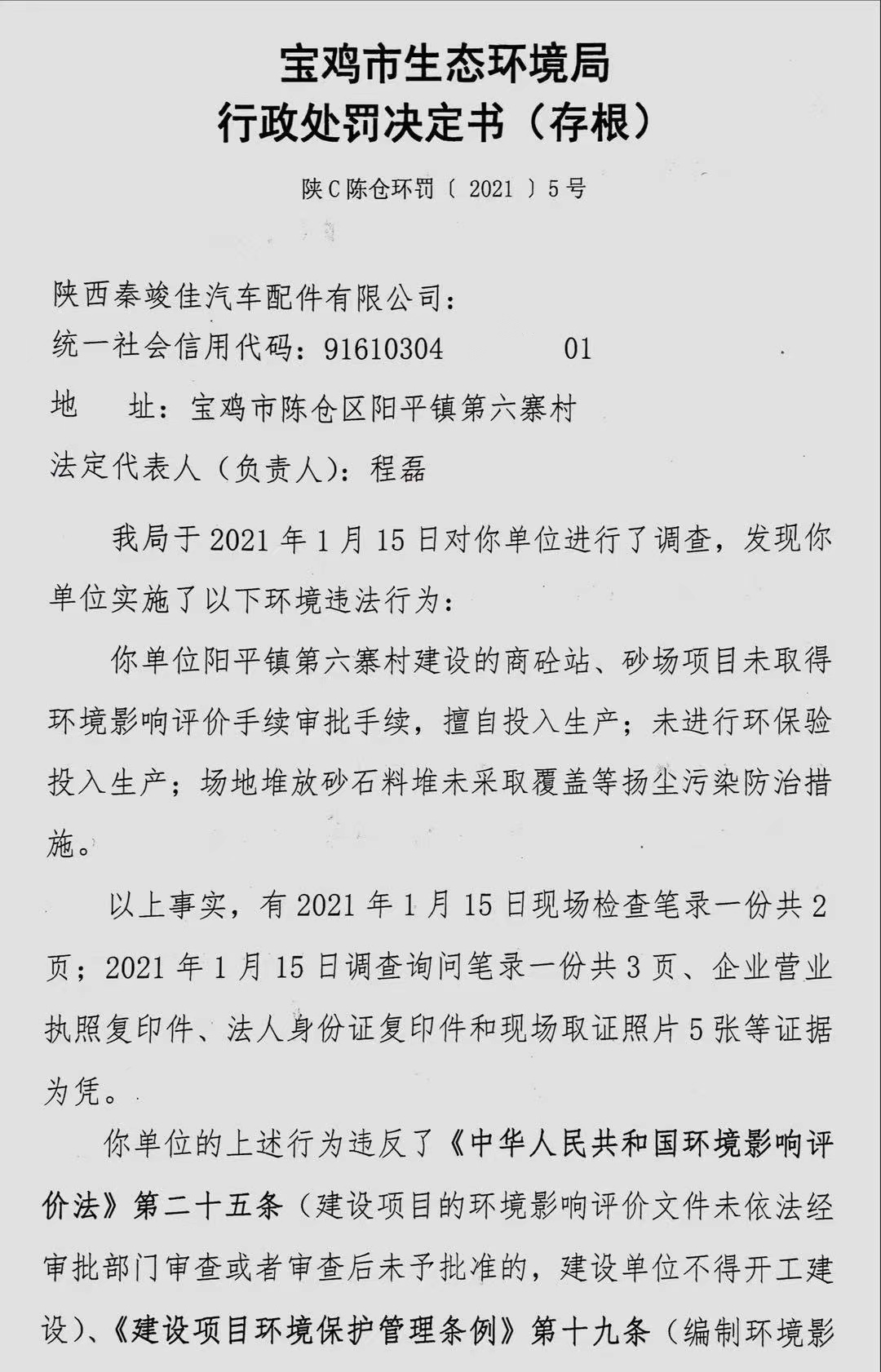 十大网赌平台排行榜 行政处罚决定书(存根) 陕C陈仓环罚〔 2021 〕5号