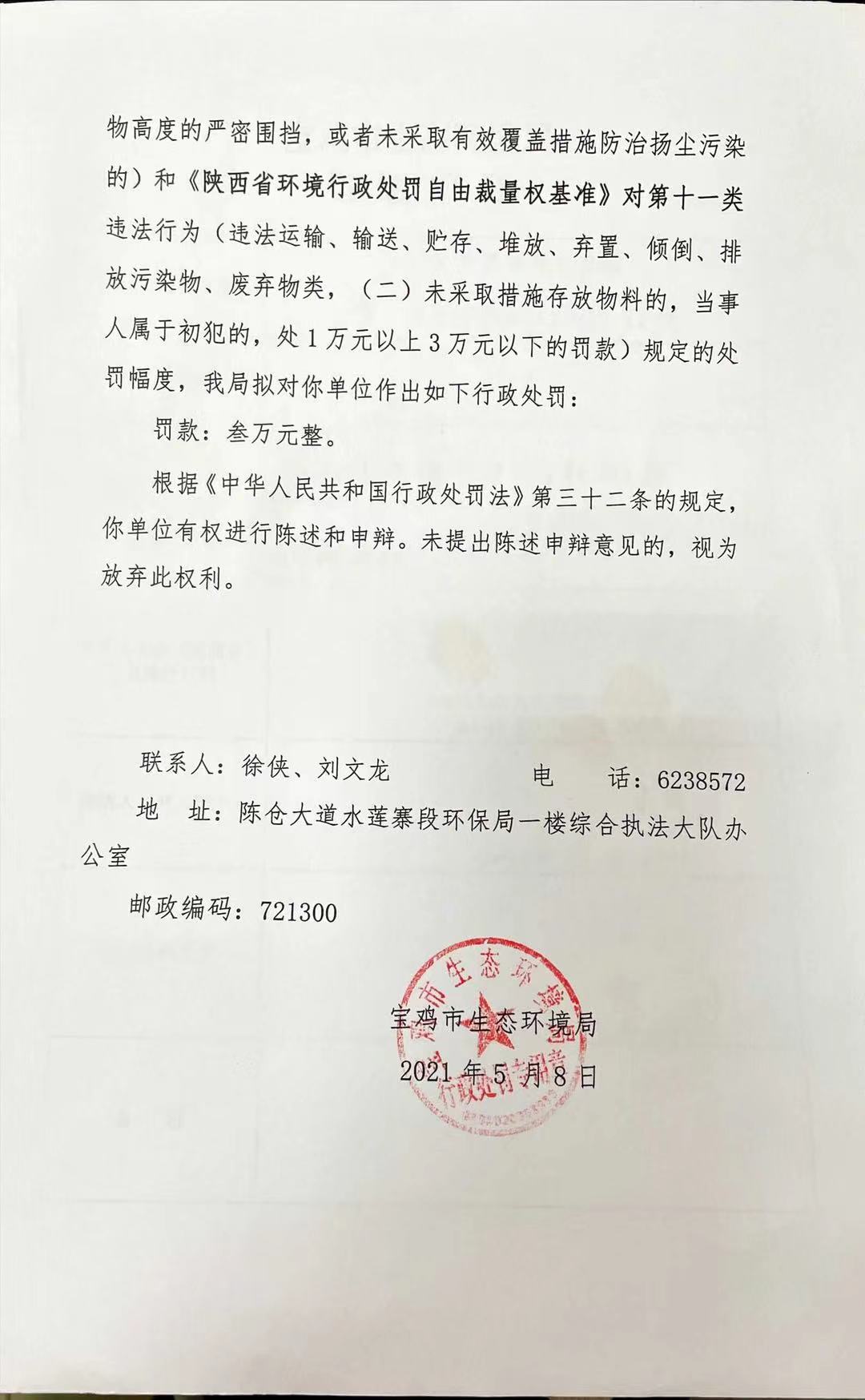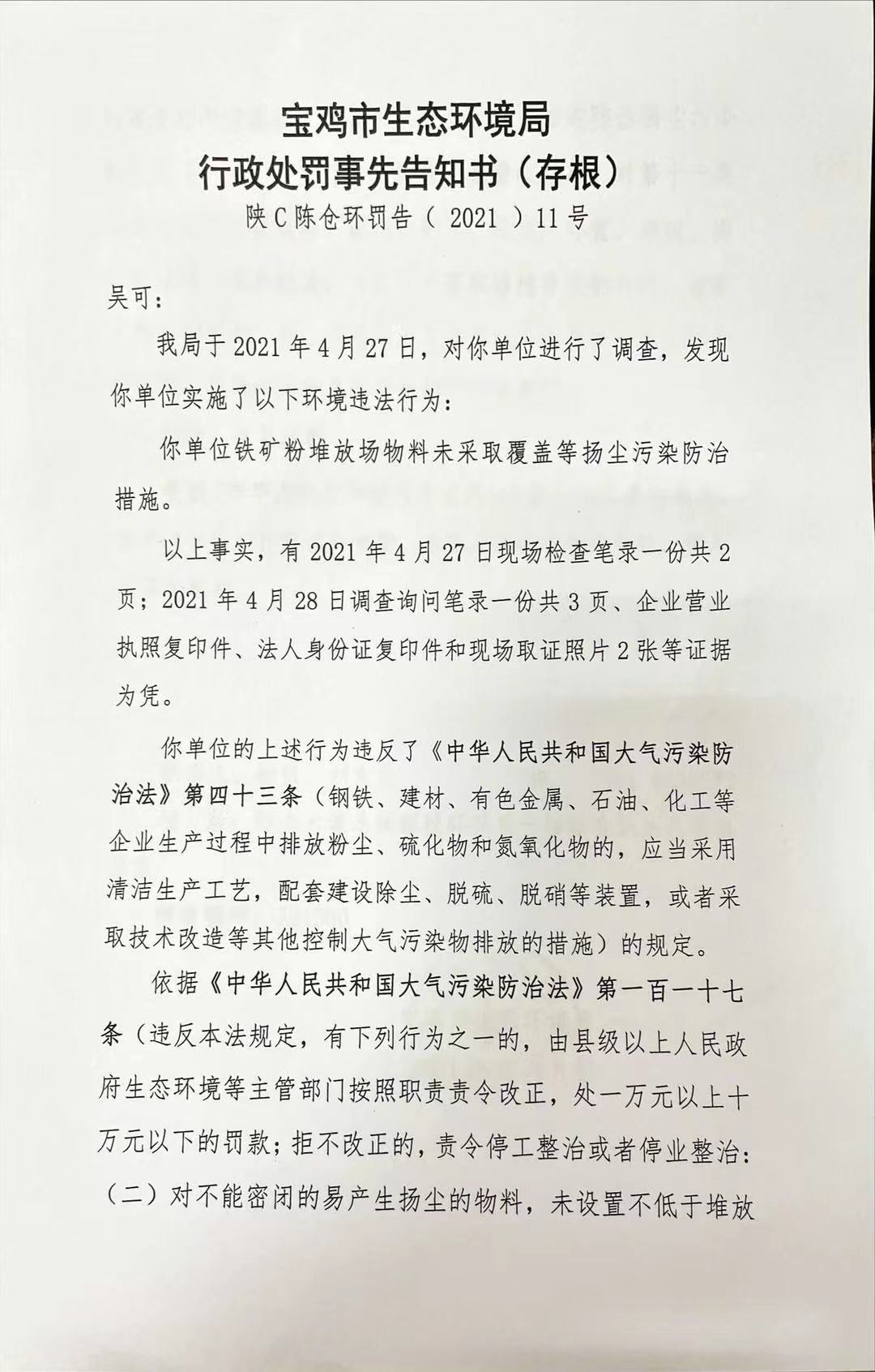 十大网赌平台排行榜 行政处罚事先告知书(存根) 陕C陈仓环罚告( 2021 )11号