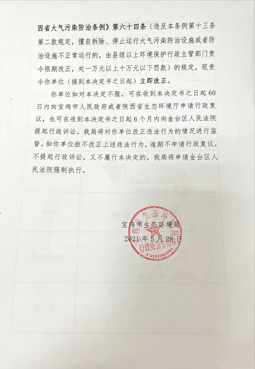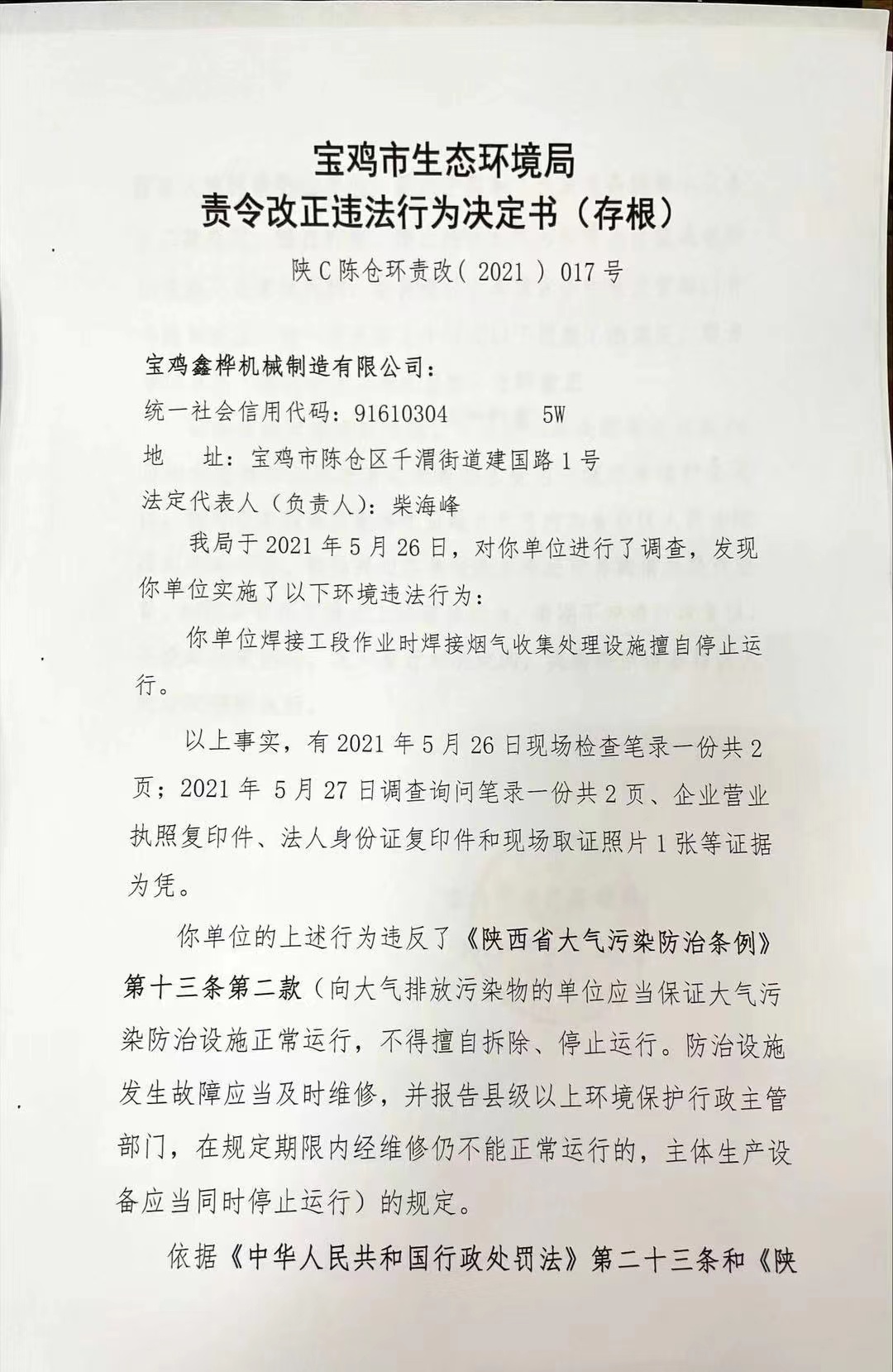 网赌平台 责令改正违法行为决定书(存根) 陕C陈仓环责改( 2021 ) 17号