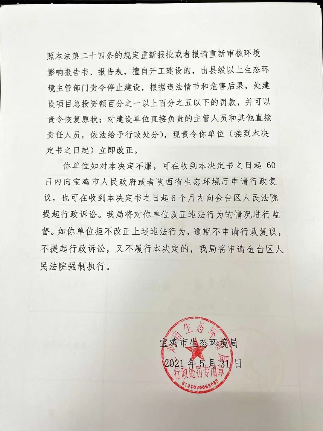十大网赌平台排行榜 责令改正违法行为决定书(存根) 陕C陈仓环责改( 2021 ) 15号