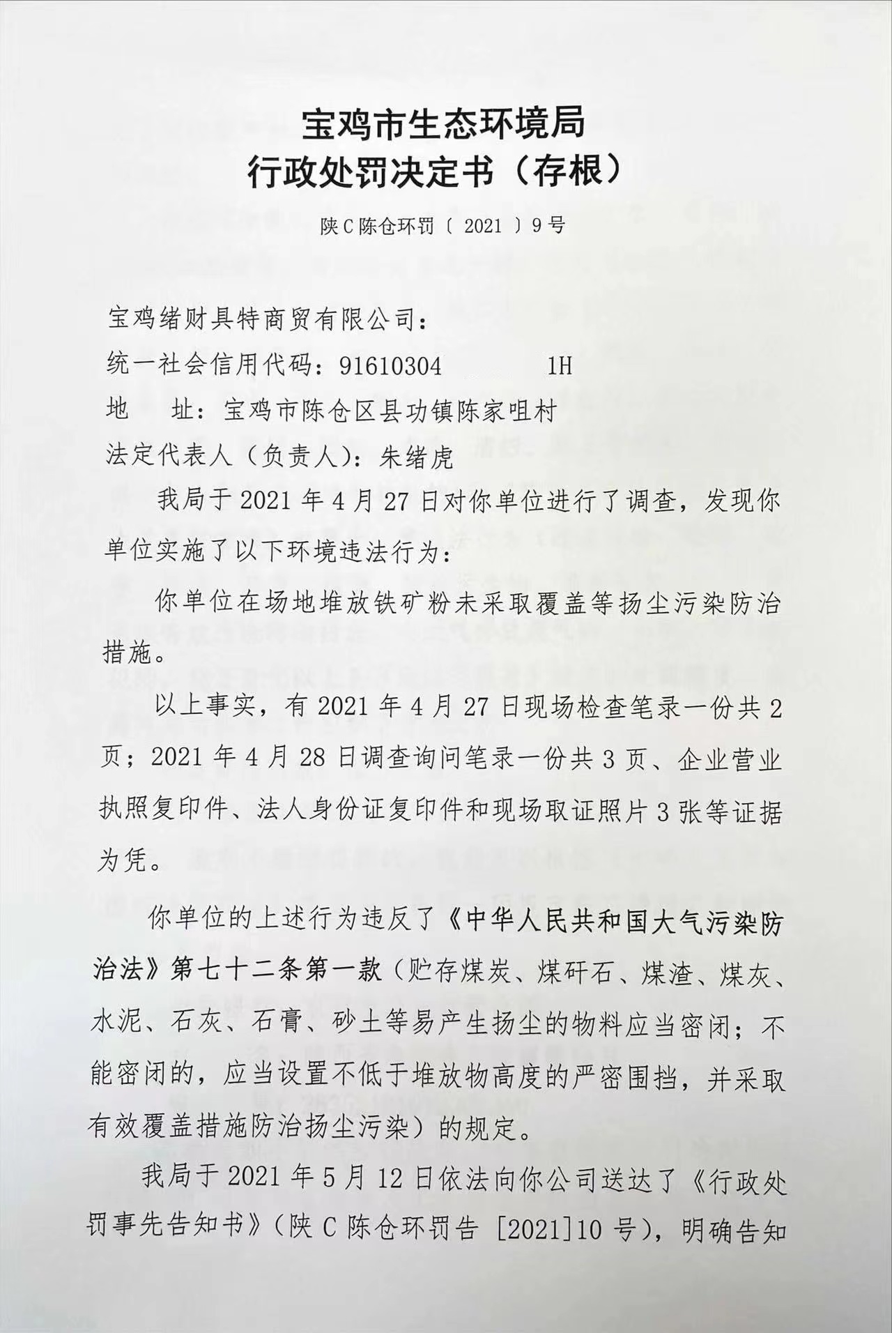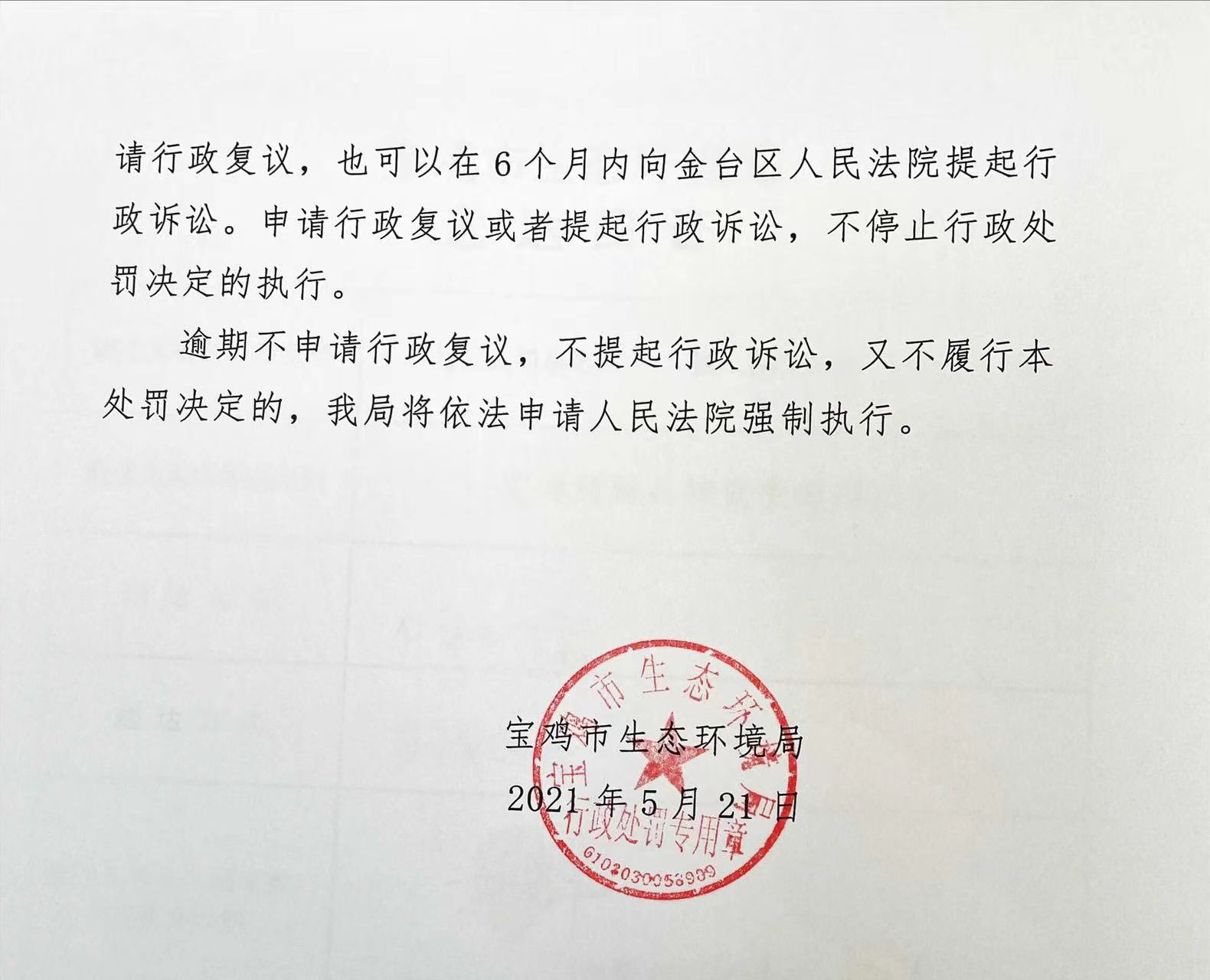 十大网赌平台排行榜 行政处罚决定书(存根) 陕C陈仓环罚〔 2021 〕9号