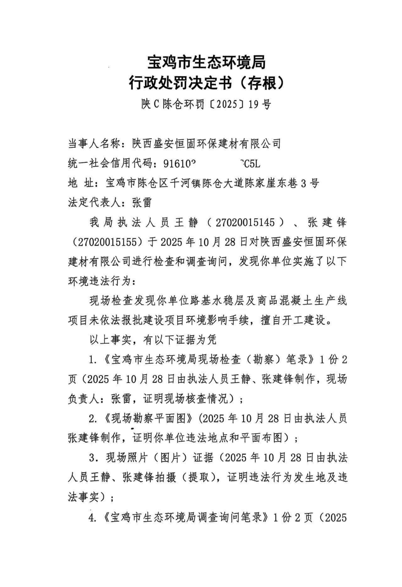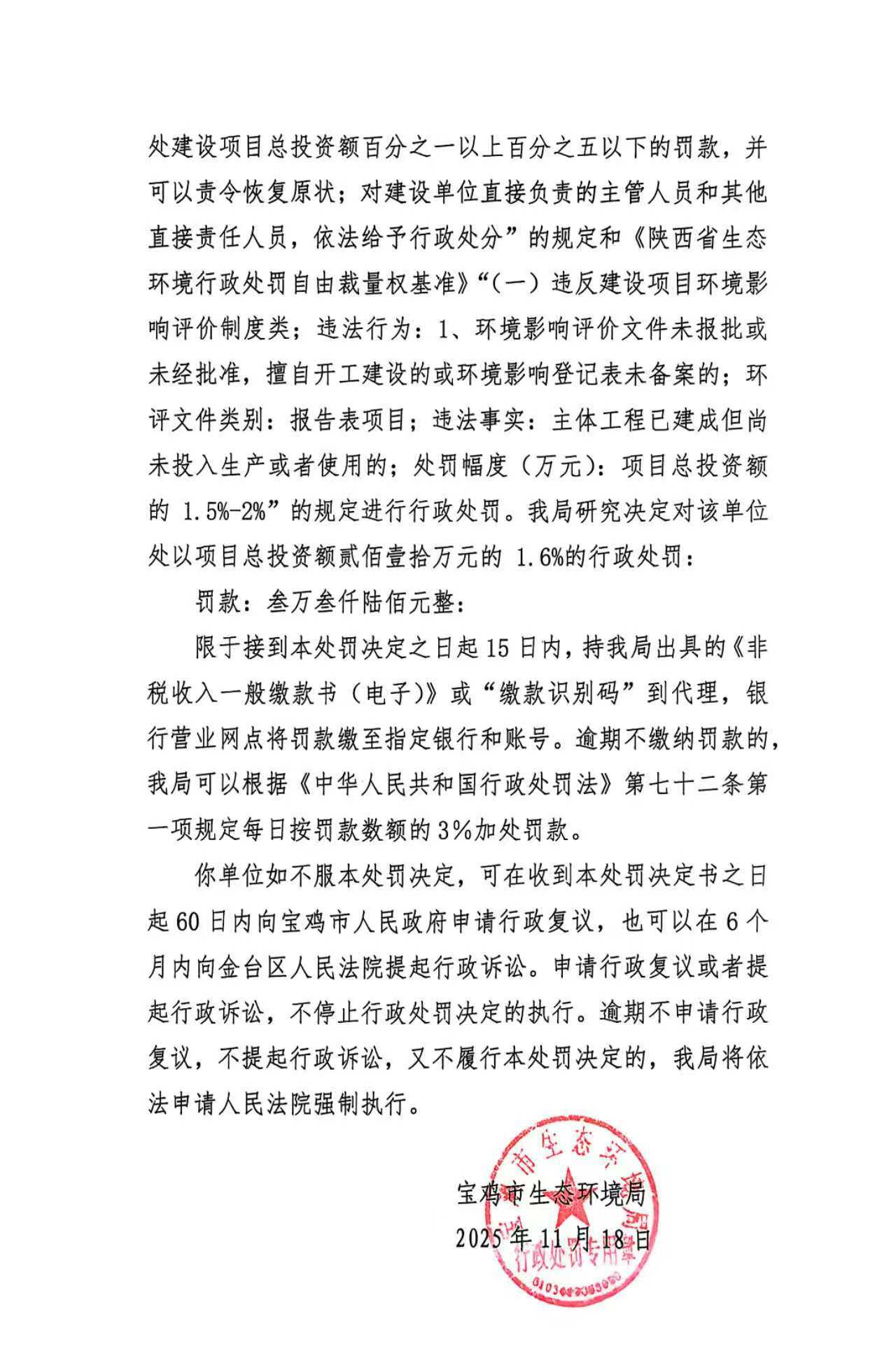 十大网赌平台排行榜行政处罚决定书(存根)陕C陈仓环罚〔2025〕19号