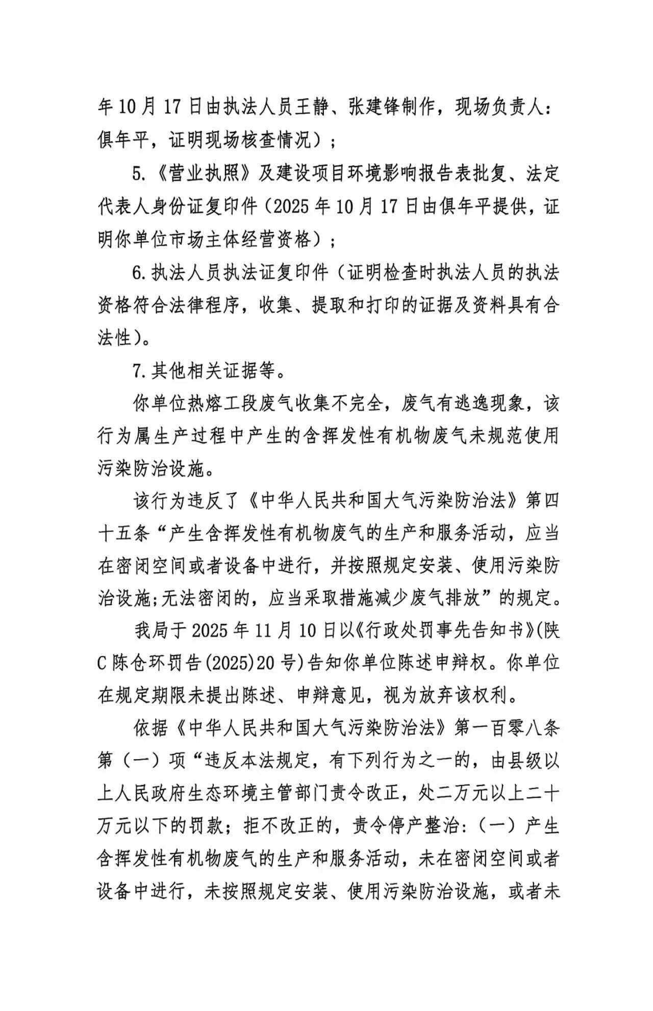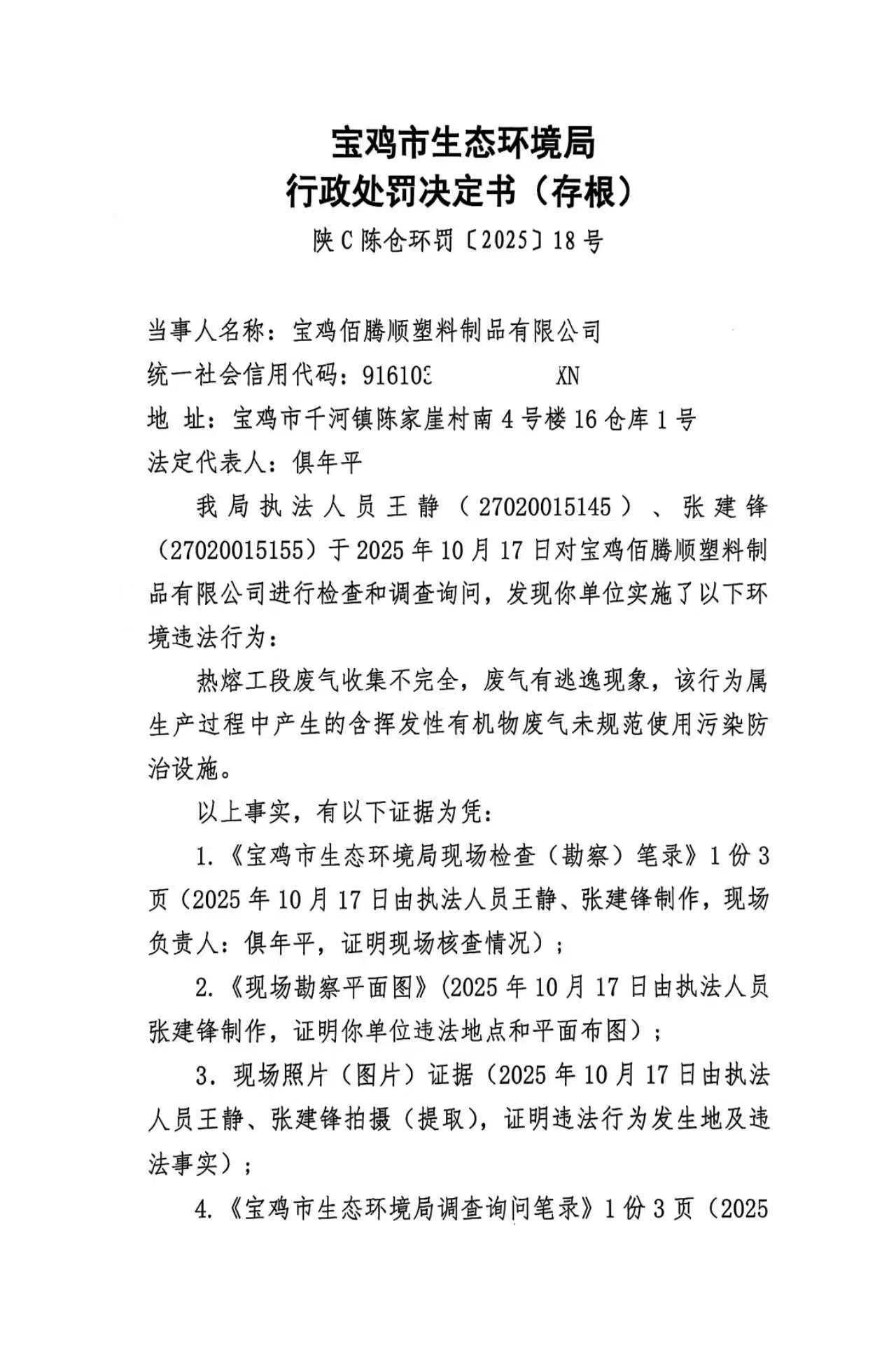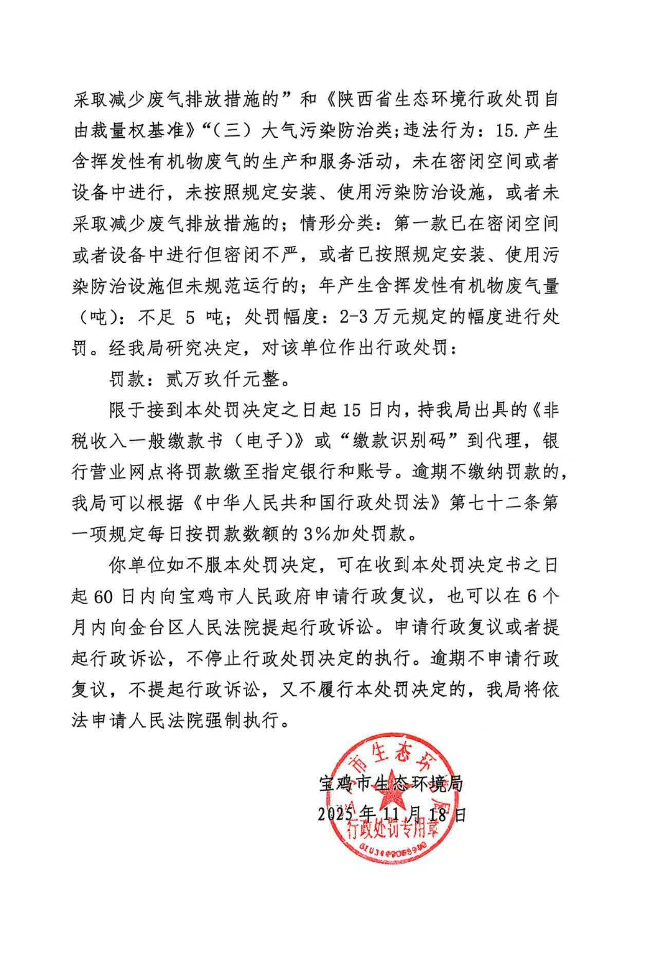 十大网赌平台排行榜行政处罚决定书(存根)陕C陈仓环罚〔2025〕18号