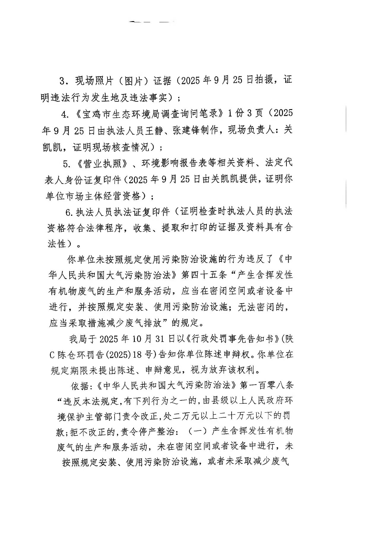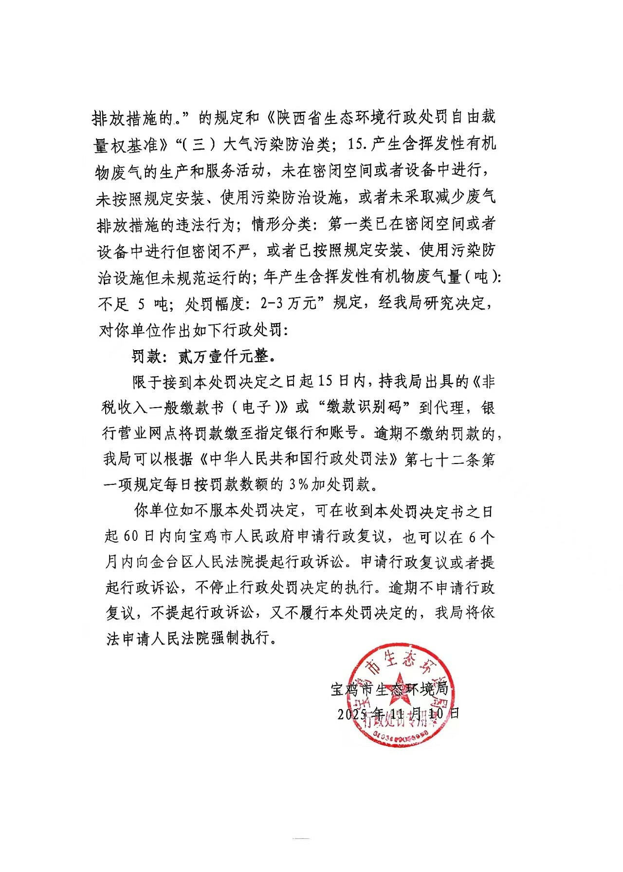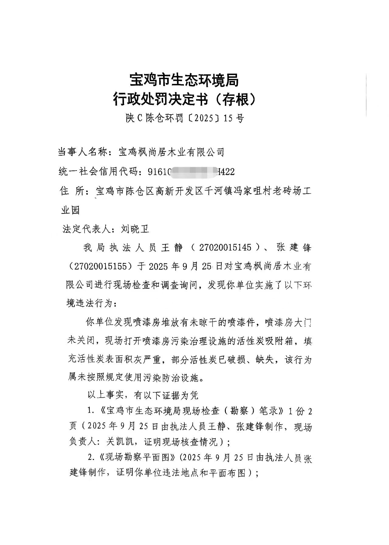 十大网赌平台排行榜行政处罚决定书(存根)陕C陈仓环罚〔2025〕15号