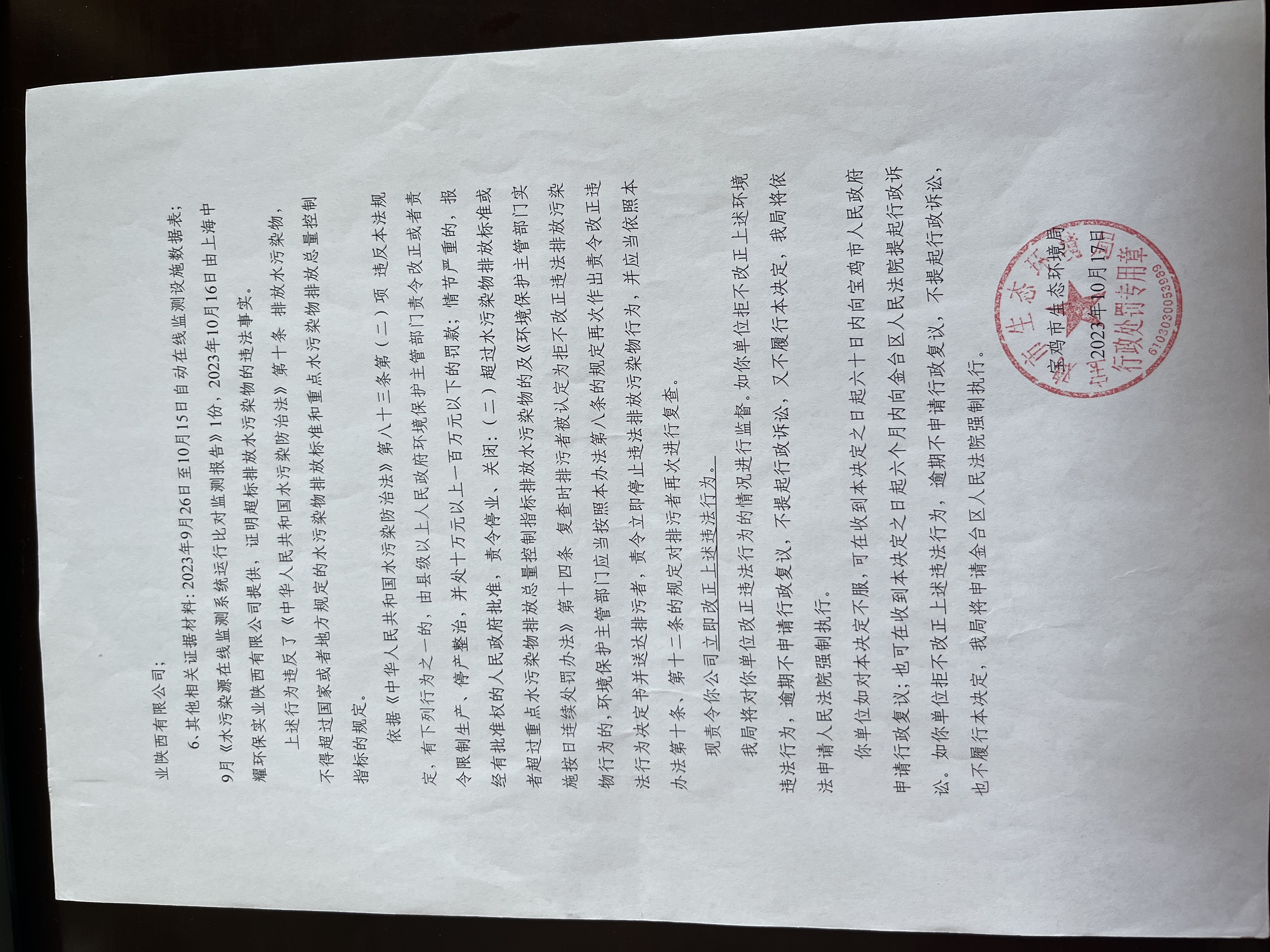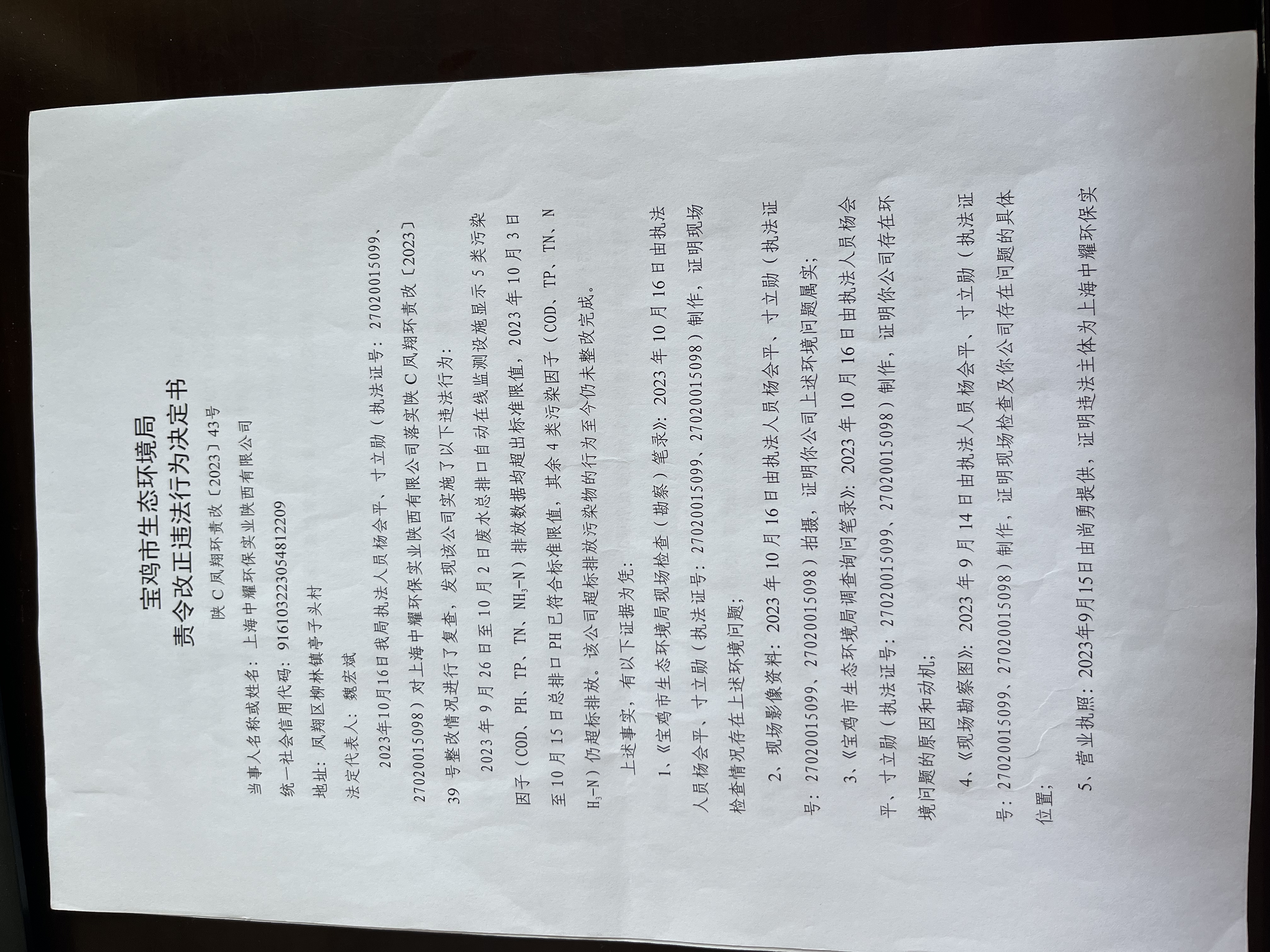 十大网赌平台排行榜责令改正违法行为决定书陕C凤翔环责改〔2023〕43号