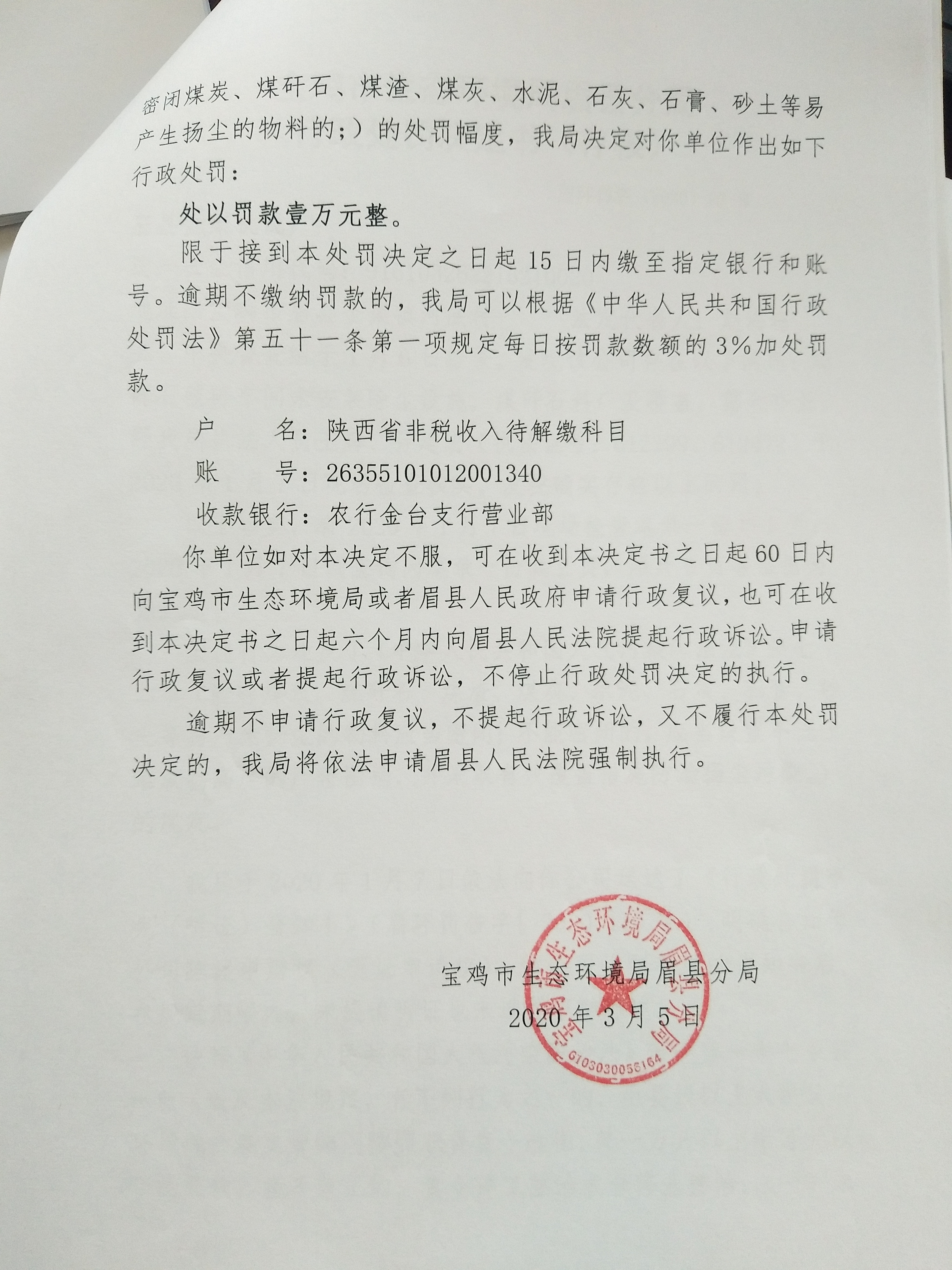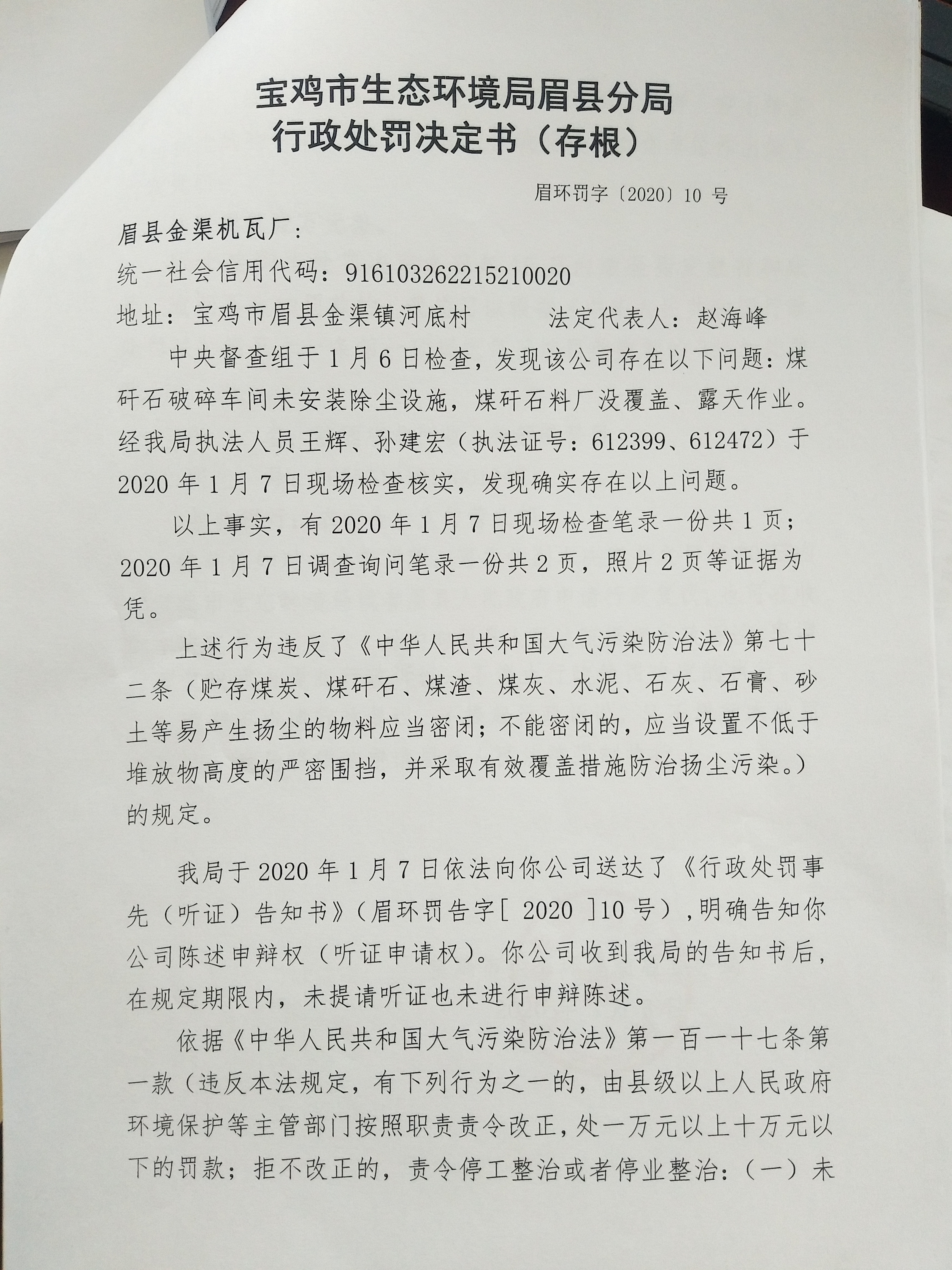 网赌平台眉县分局行政处罚决定书 眉环罚字(2020)10号