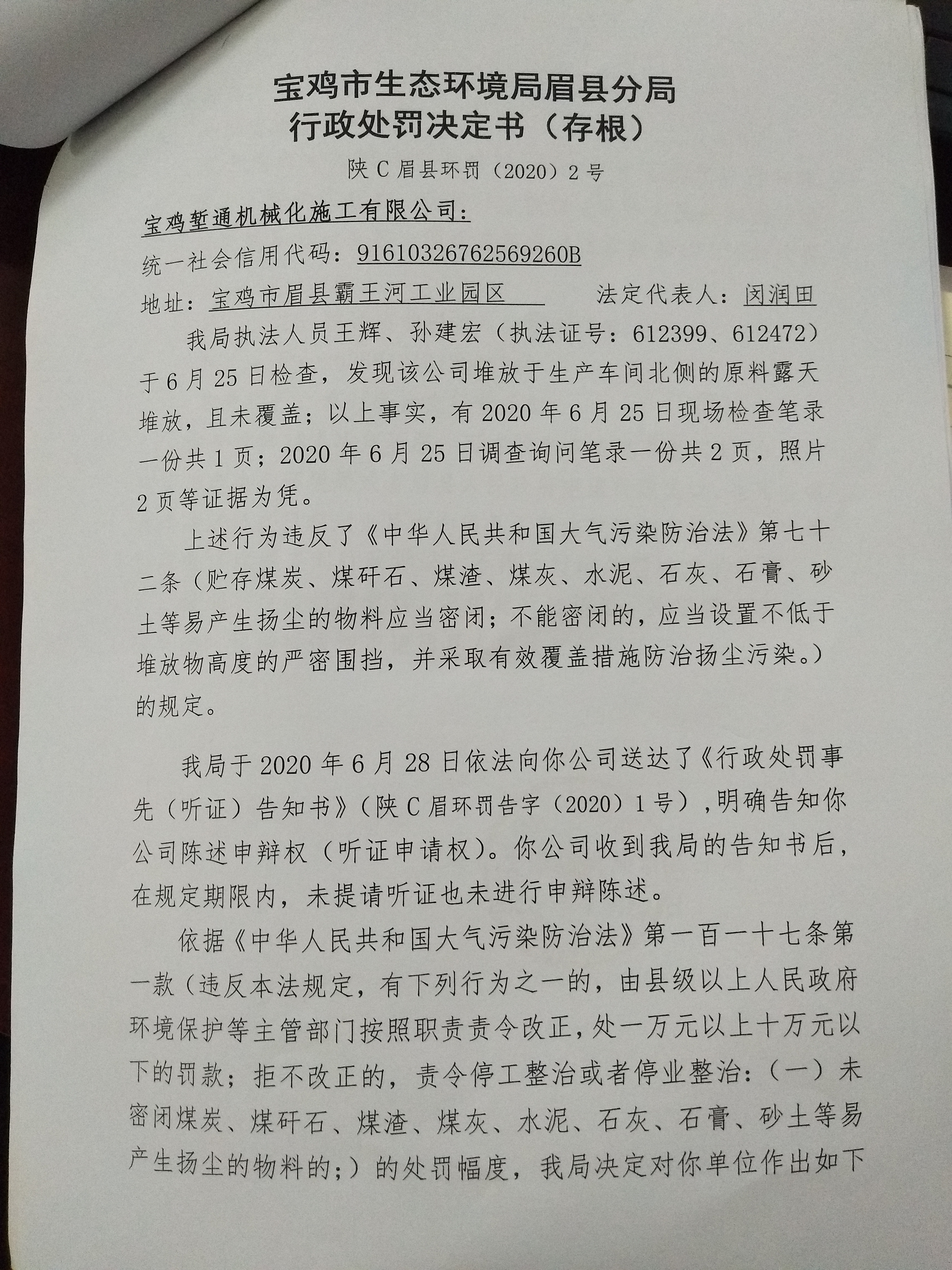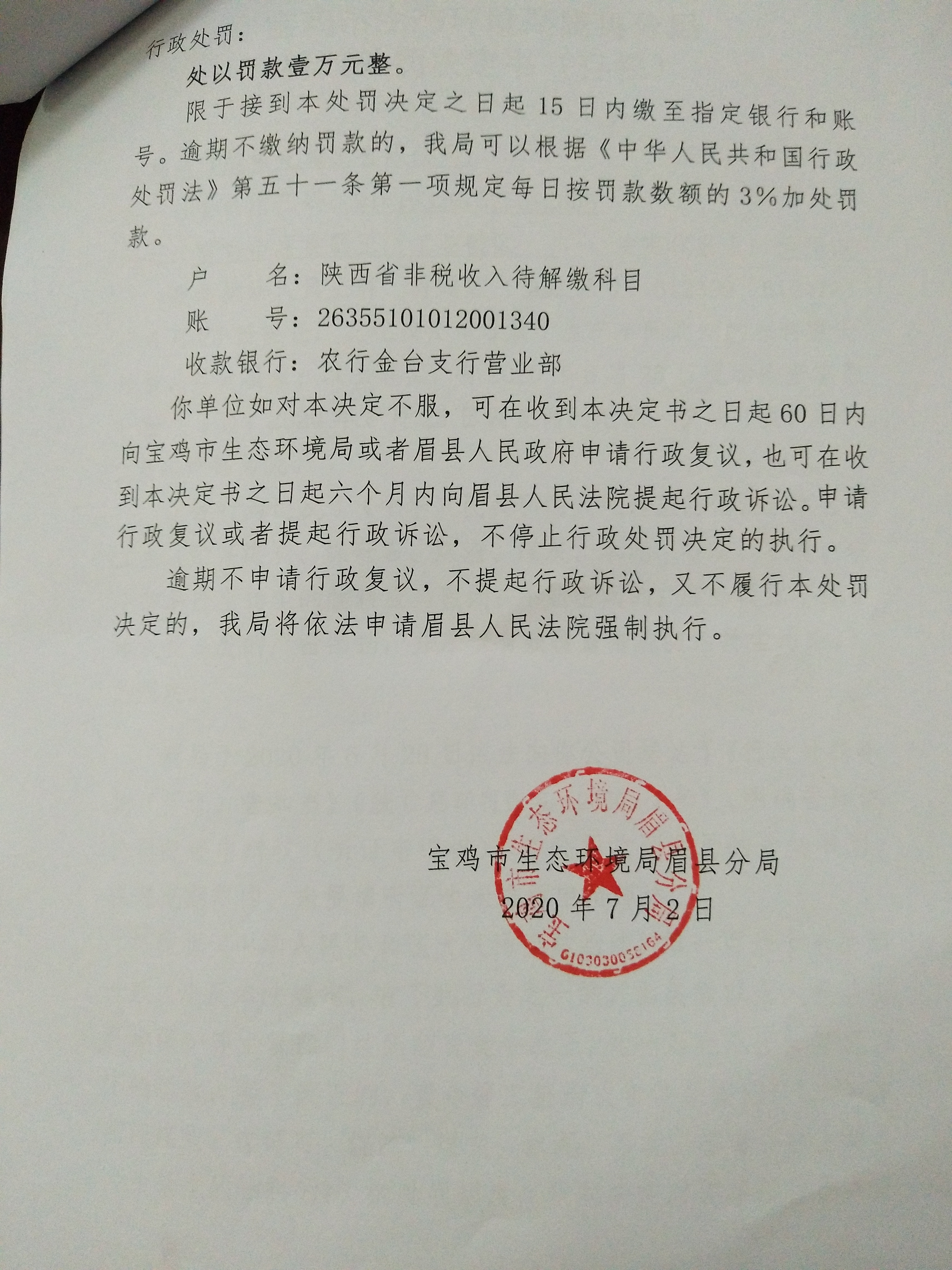 十大网赌平台排行榜眉县分局行政处罚决定书 陕C眉县环罚(2020)2号