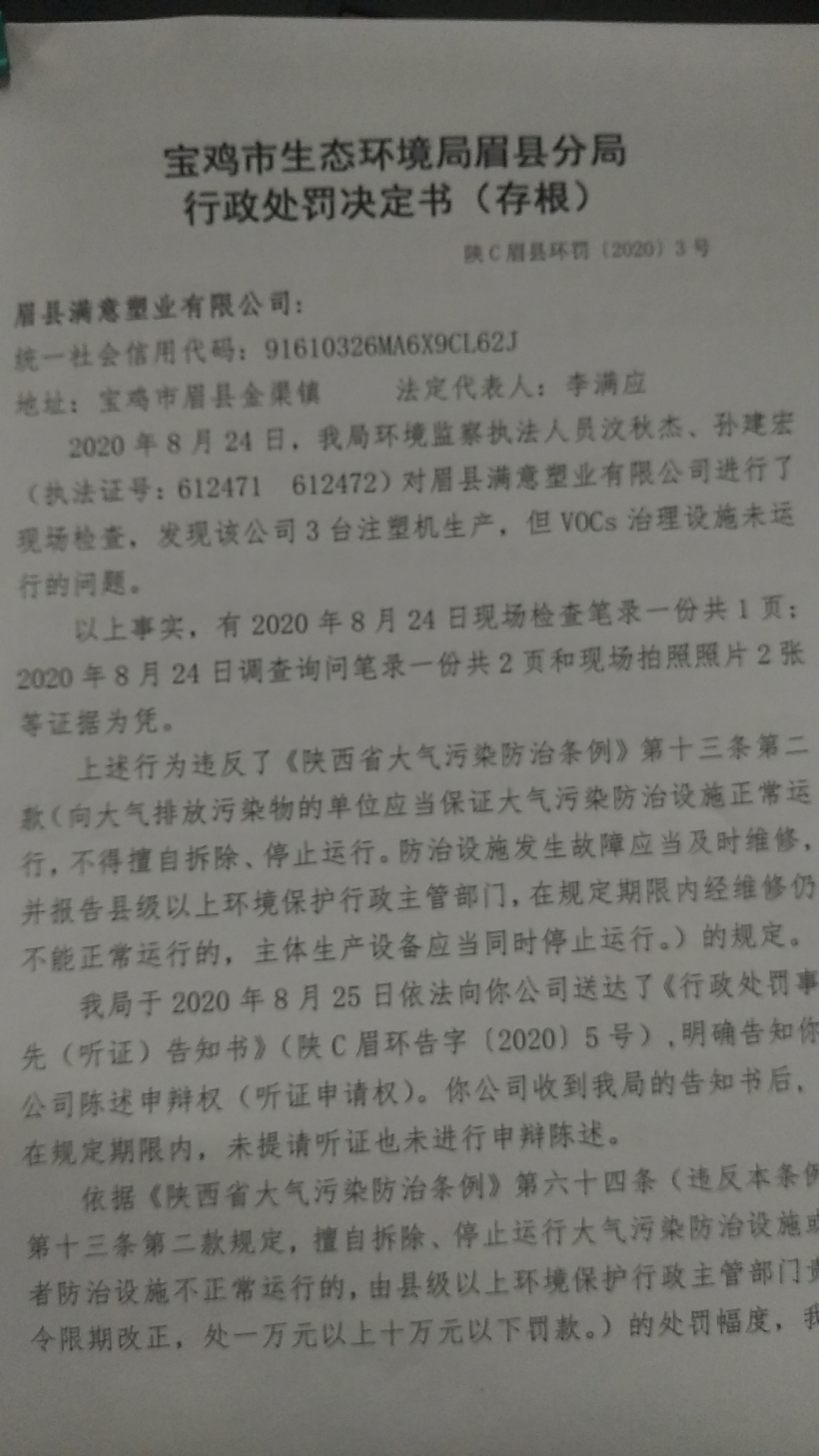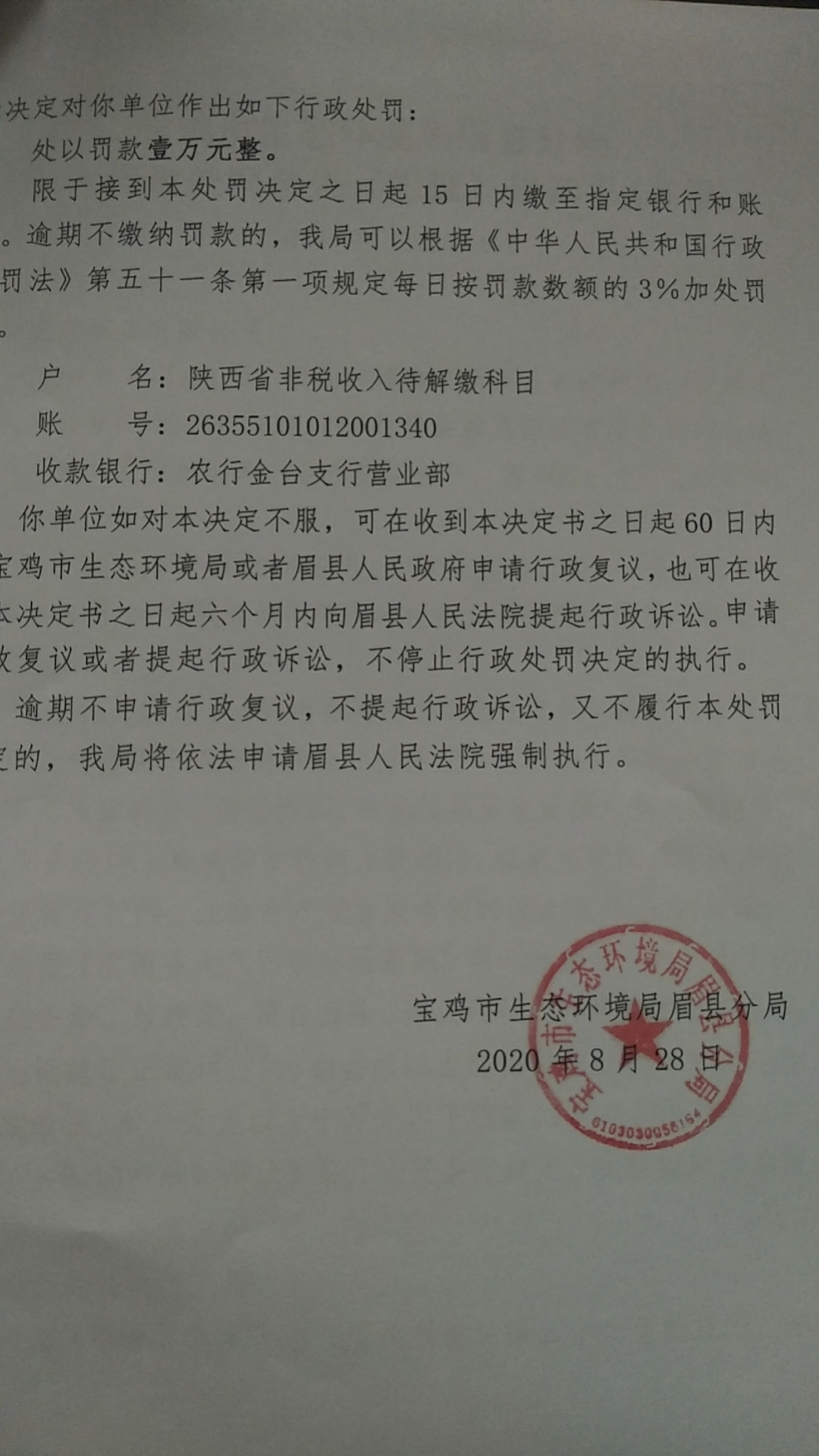 网赌平台眉县分局行政处罚决定书 陕C眉县环罚(2020)3号