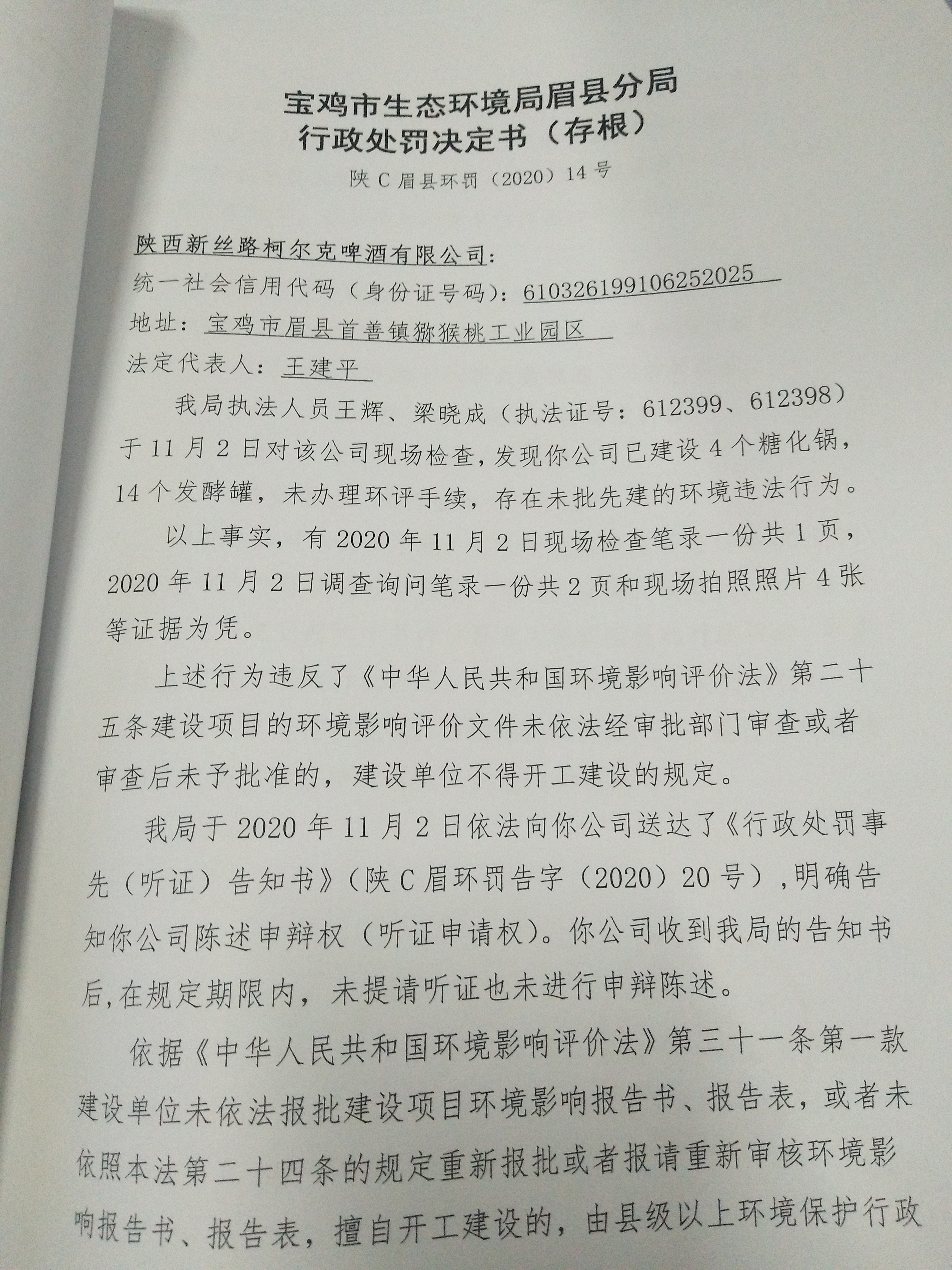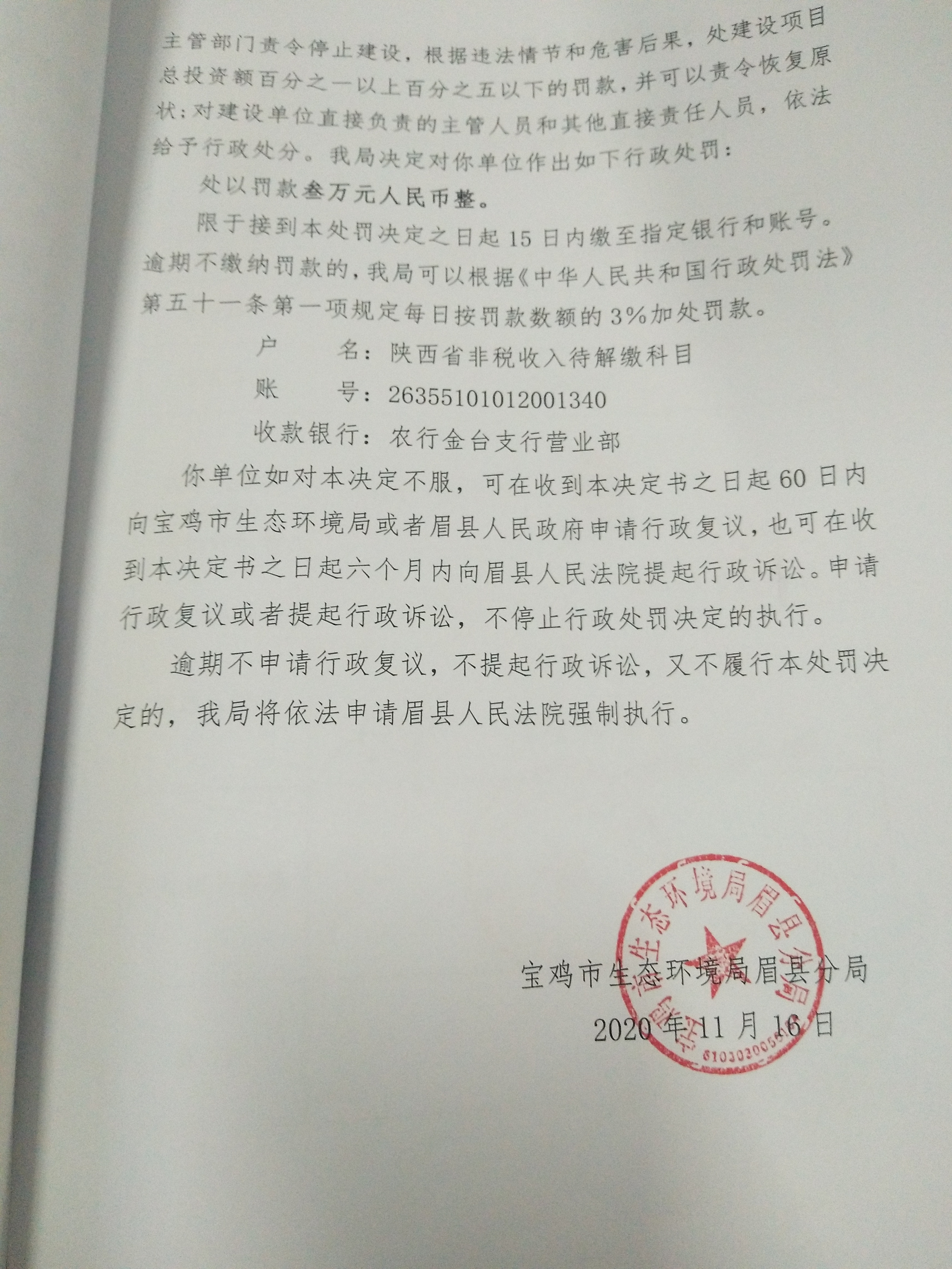 十大网赌平台排行榜眉县分局行政处罚决定书(存根) 陕C眉县环罚〔2020〕14号