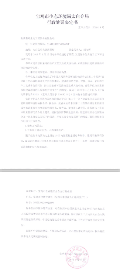陕西秦岭生物工程股份有限公司行政处罚决定书