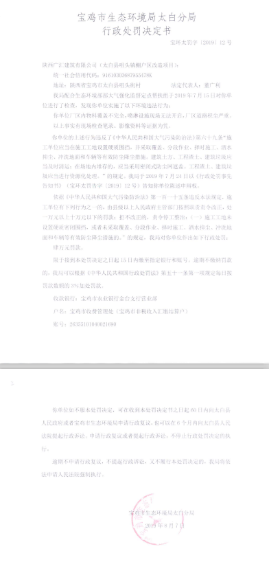 陕西广汇建筑有限公司(太白县咀头镇棚户区改造项目)行政处罚决定书