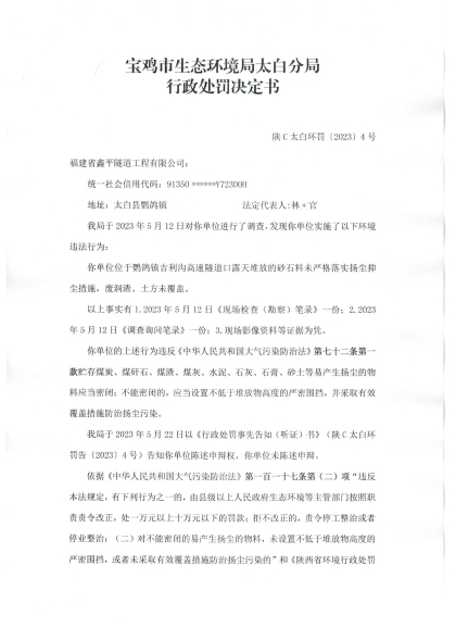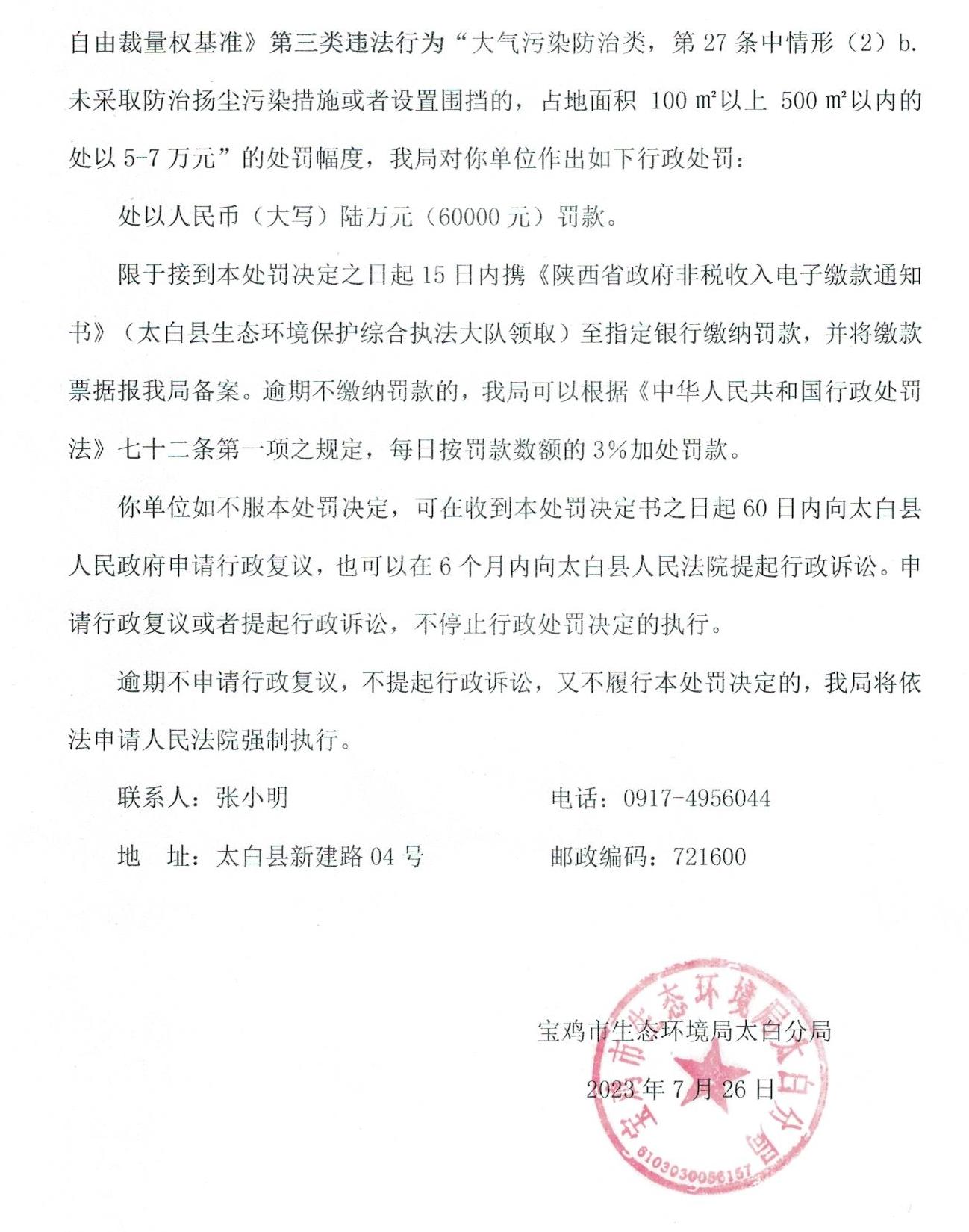 网赌平台太白分局行政处罚决定书陕C太白环罚〔2023〕4号