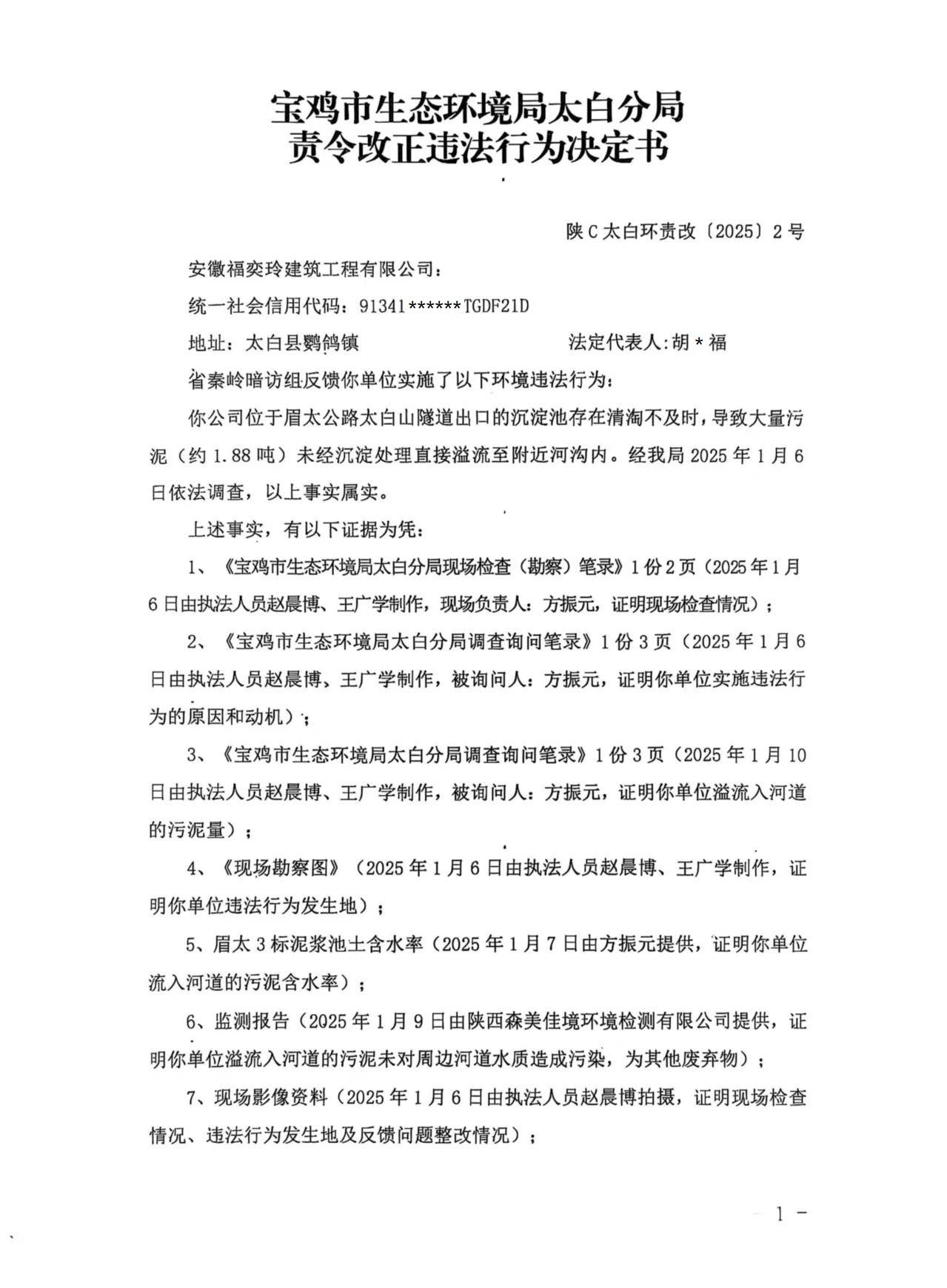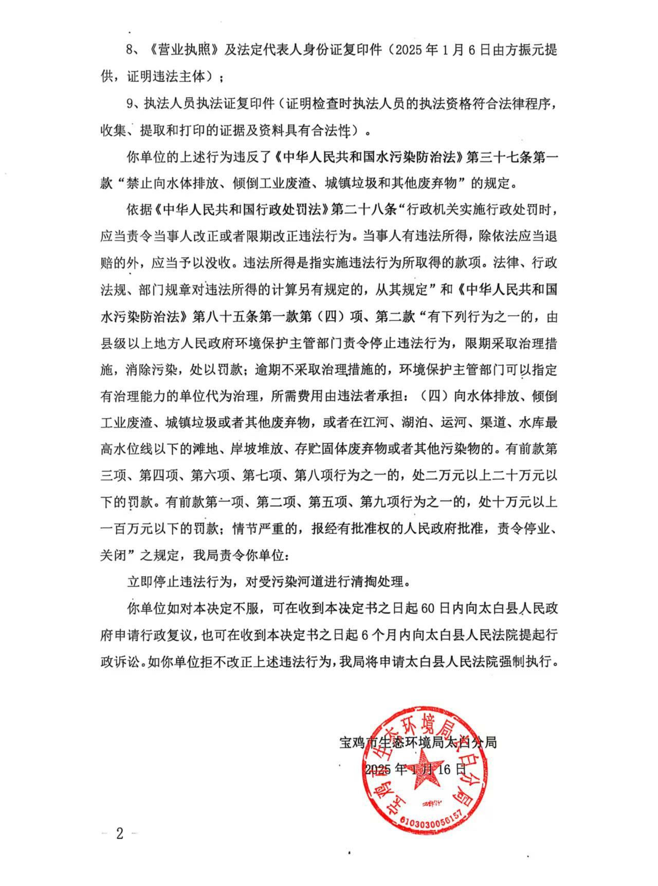 网赌平台太白分局责令改正违法行为决定书陕C太白环责改〔2025〕2号