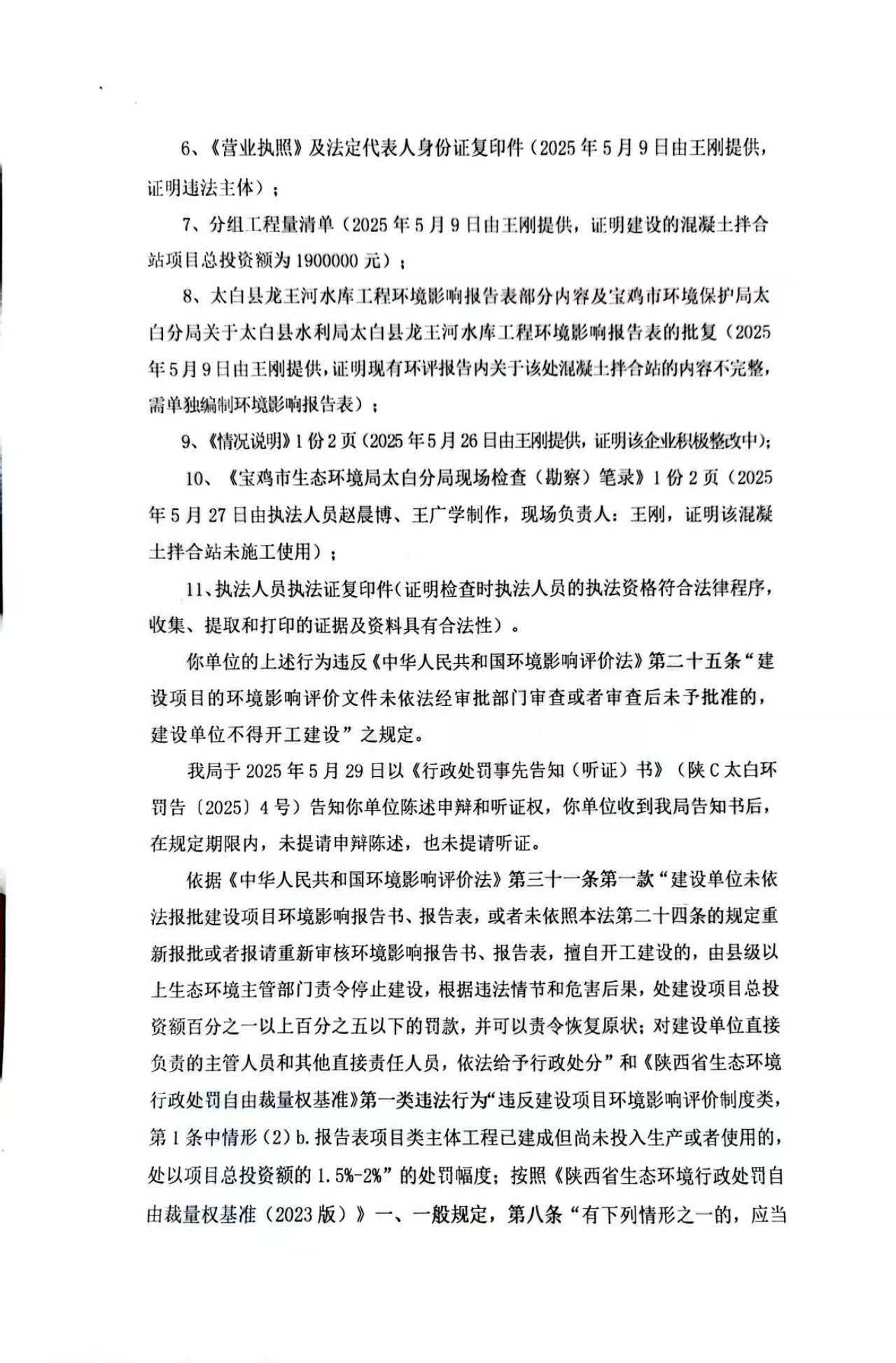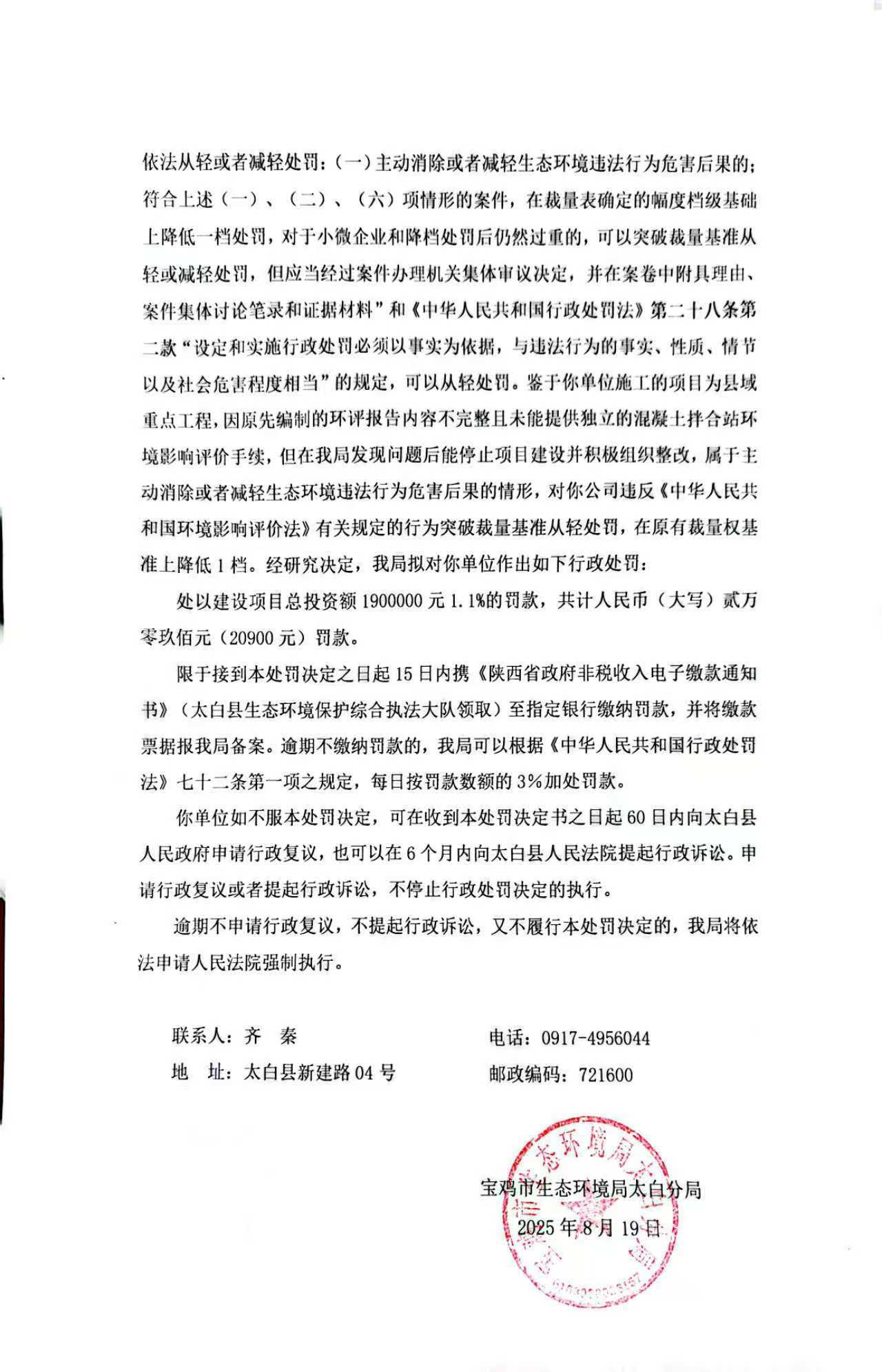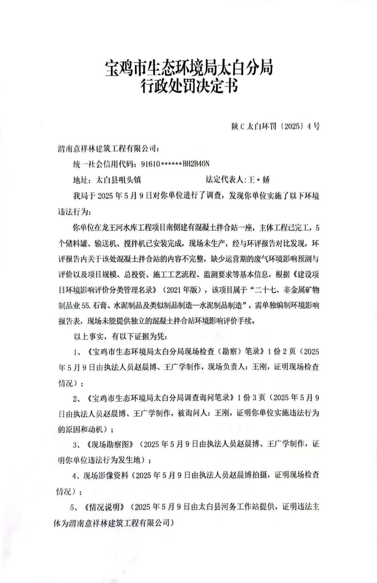 网赌平台太白分局行政处罚决定书陕C太白环罚〔2025〕4号