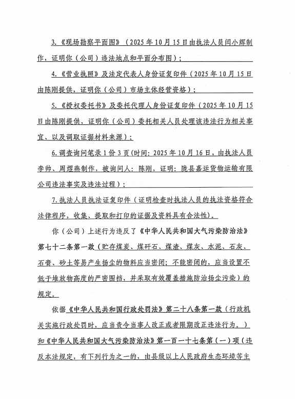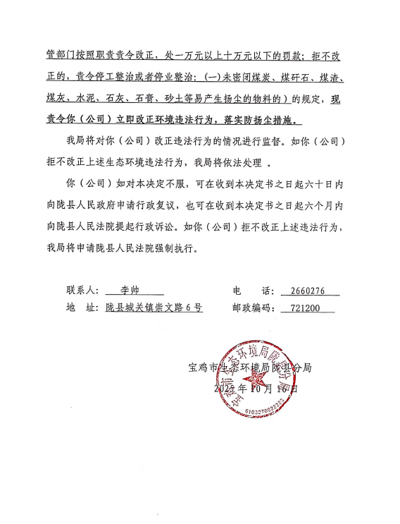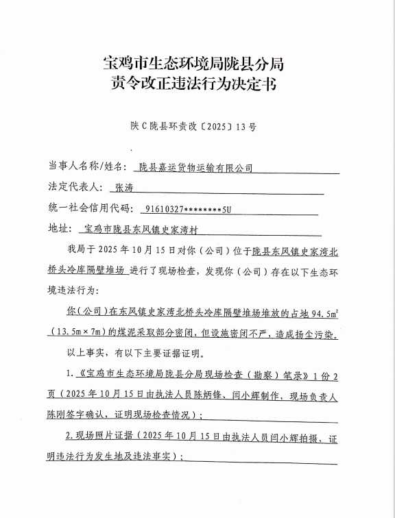 十大网赌平台排行榜陇县分局责令改正违法行为决定书 陕C陇县环责改〔2025〕13号