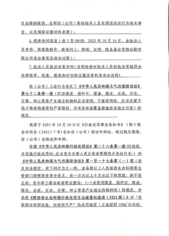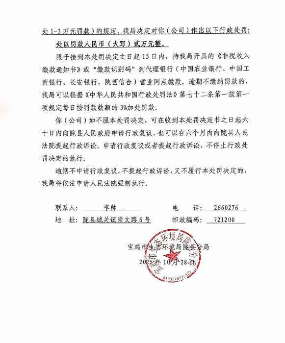 十大网赌平台排行榜陇县分局行政处罚决定书 陕C陇县环罚〔2025〕7号