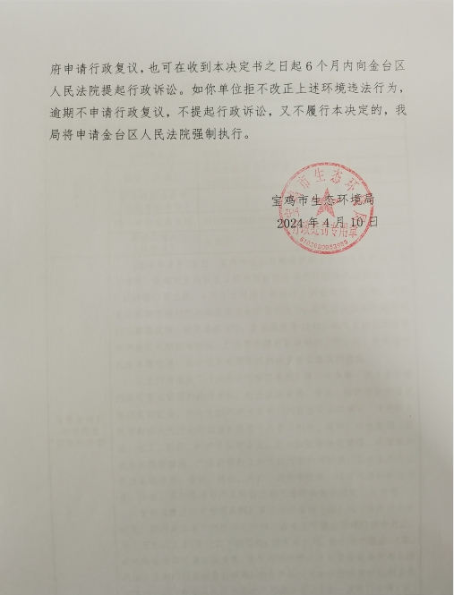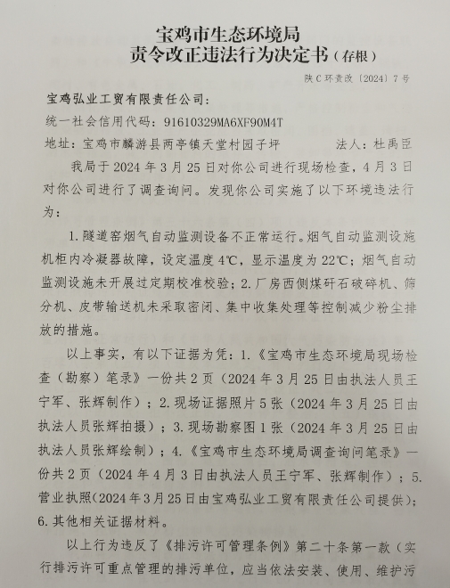 十大网赌平台排行榜责令改正违法行为决定书 陕C环责改[2024]7号