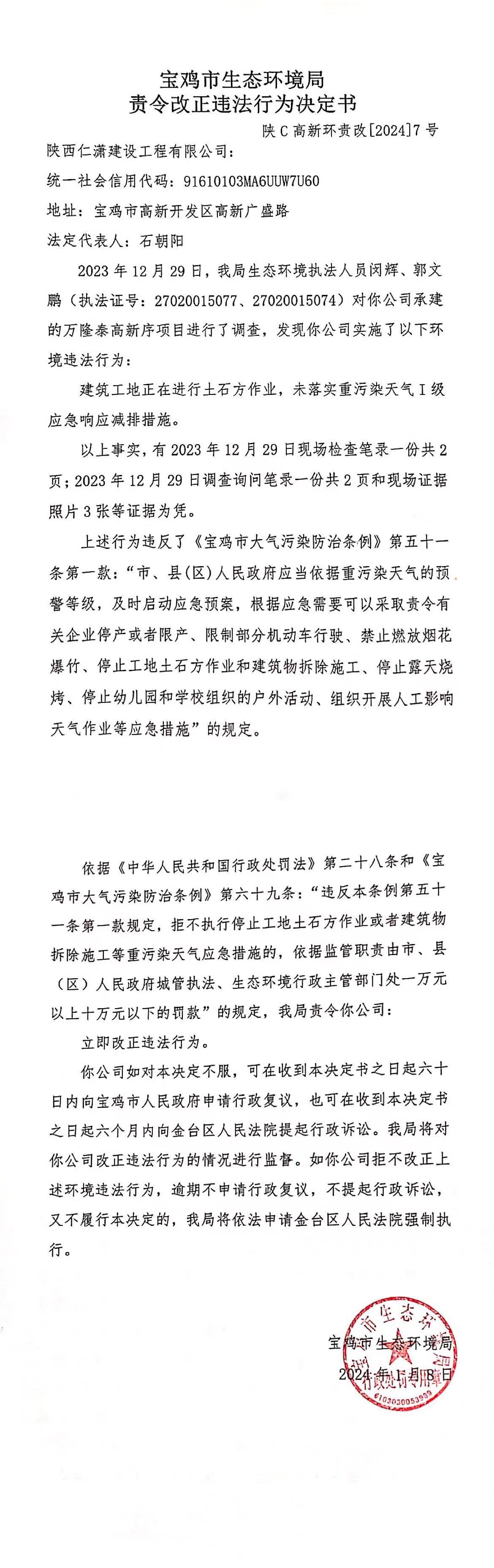 陕c高新环责改[2024]7号
