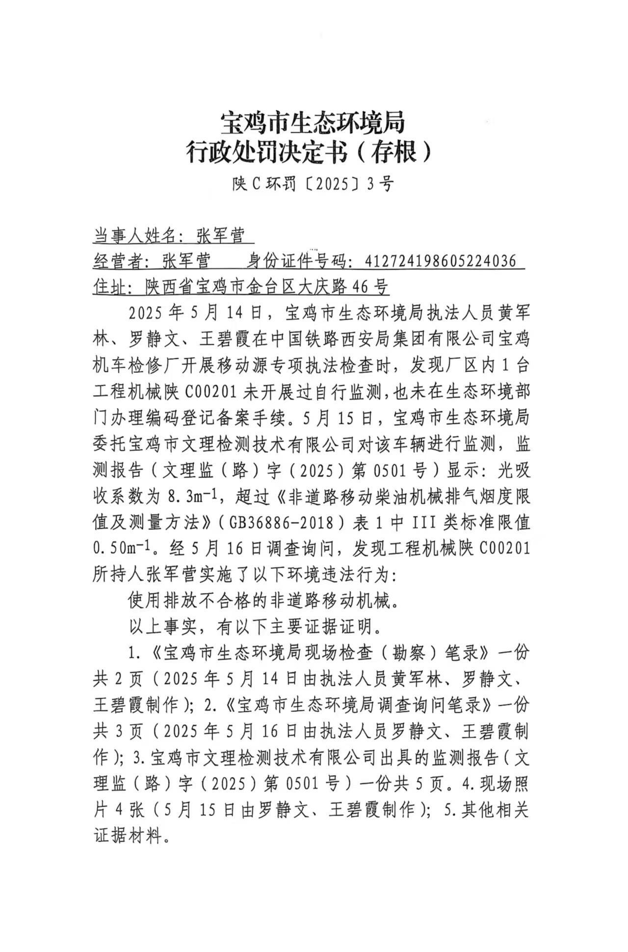 十大网赌平台排行榜 行政处罚决定书 陕 C环罚〔2025]3号