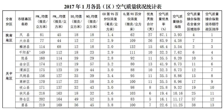 2017年1月,各县区城市环境空气质量综合指数平均值为8.22,其中关中地区空气质量综合指数平均值为8.96,陕南地区空气质量综合指数平均值为4.16。空气质量由好到差依次是凤县、太白县、麟游县、千阳县、陇县、金台区、渭滨区、凤翔县、高新区、岐山县、扶风县、陈仓区、眉县。综合分析,细颗粒物(PM2.5)是影响1月份全市空气质量的主要指标。