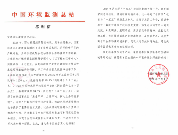 近日,市环境监测中心站收到一封来自中国环境监测总站的感谢信,对中心站在深入打好水污染防治攻坚战、推动水环境质量持续改善中所做的贡献表示感谢。