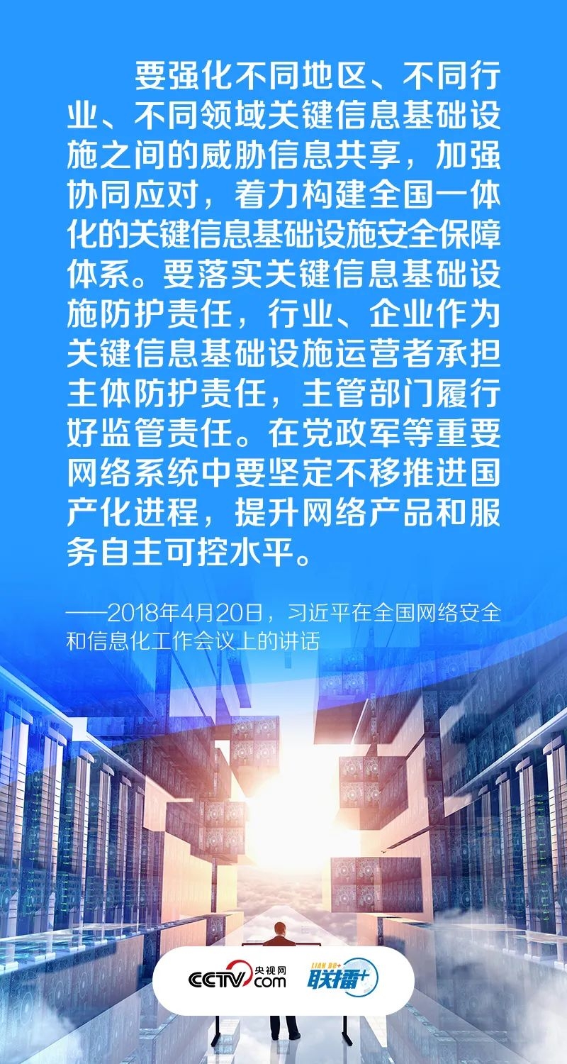 “金融、能源、电力、通信、交通等领域的关键信息基础设施是经济社会运行的神经中枢,是网络安全的重中之重,也是可能遭到重点攻击的目标。”习近平总书记强调,关键信息基础设施是网络安全防护的重中之重,“我们必须深入研究,采取有效措施,切实做好国家关键信息基础设施安全防护”。