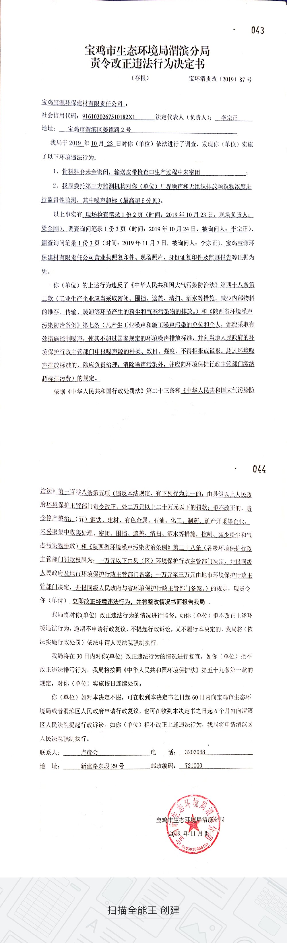 十大网赌平台排行榜渭滨分局责令改正违法行为决定书(宝环渭责改〔2019〕87号)