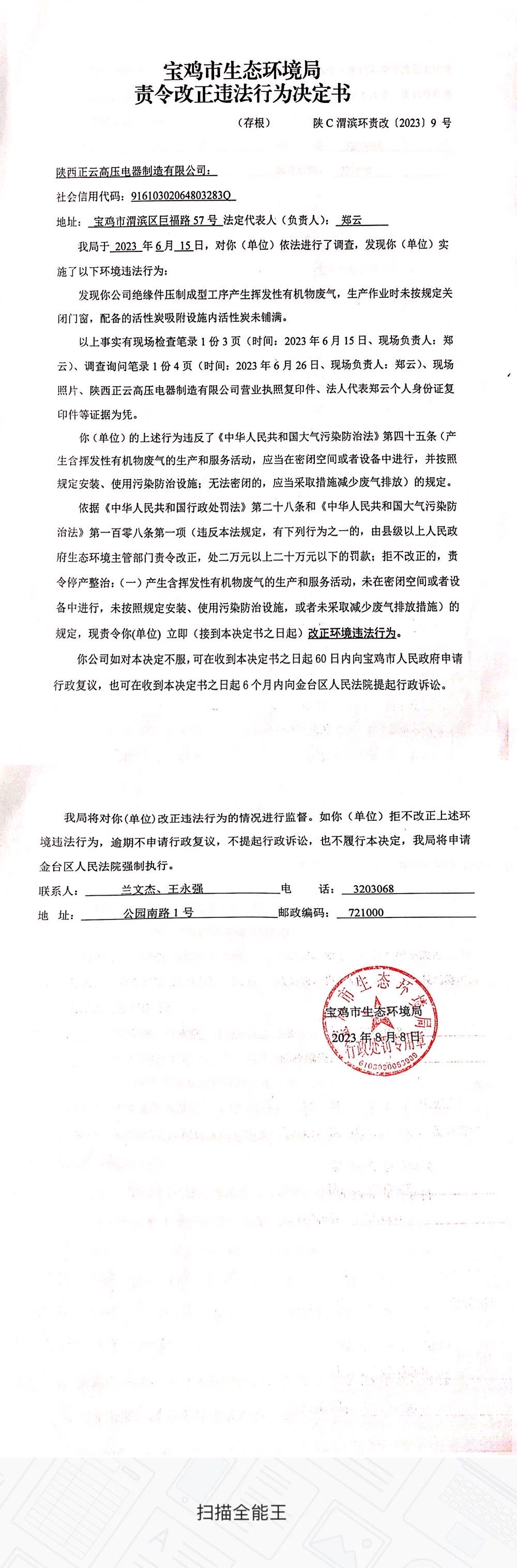 十大网赌平台排行榜责令改正违法行为决定书(陕C渭滨环责改〔2023〕9号)