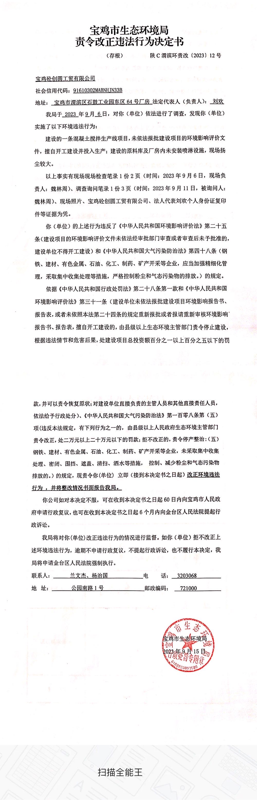 十大网赌平台排行榜责令改正违法行为决定书(陕C渭滨环责改〔2023〕12号)