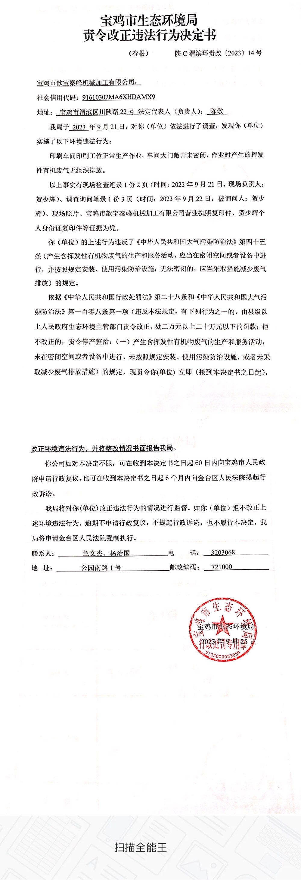 十大网赌平台排行榜责令改正违法行为决定书(陕C渭滨环责改〔2023〕14号)