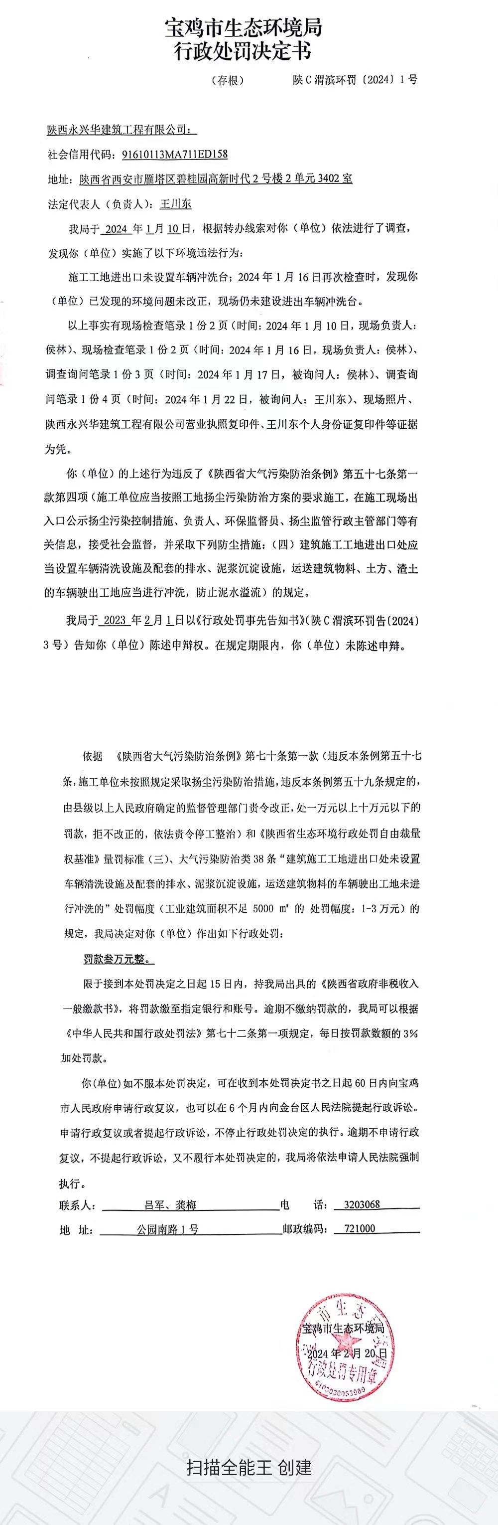 网赌平台行政处罚决定书(陕C渭滨环罚〔2024〕1号)