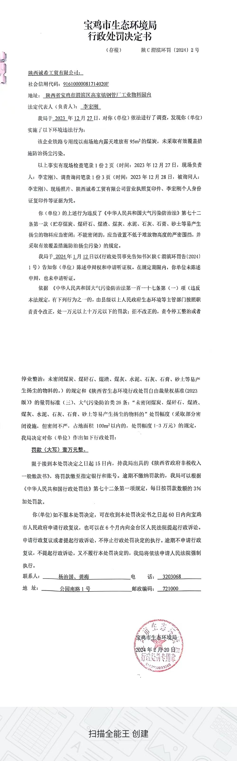 十大网赌平台排行榜行政处罚决定书(陕C渭滨环罚〔2024〕2号)