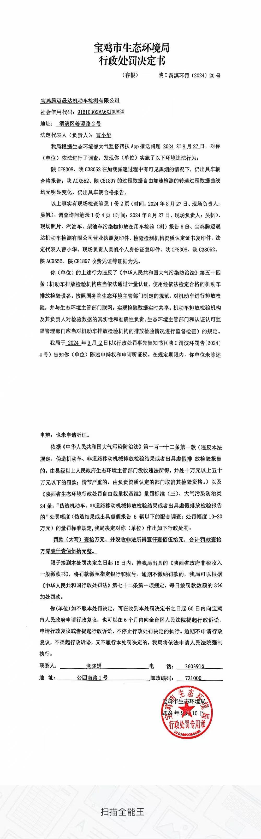 网赌平台行政处罚决定书(陕C渭滨环罚〔2024〕20号)